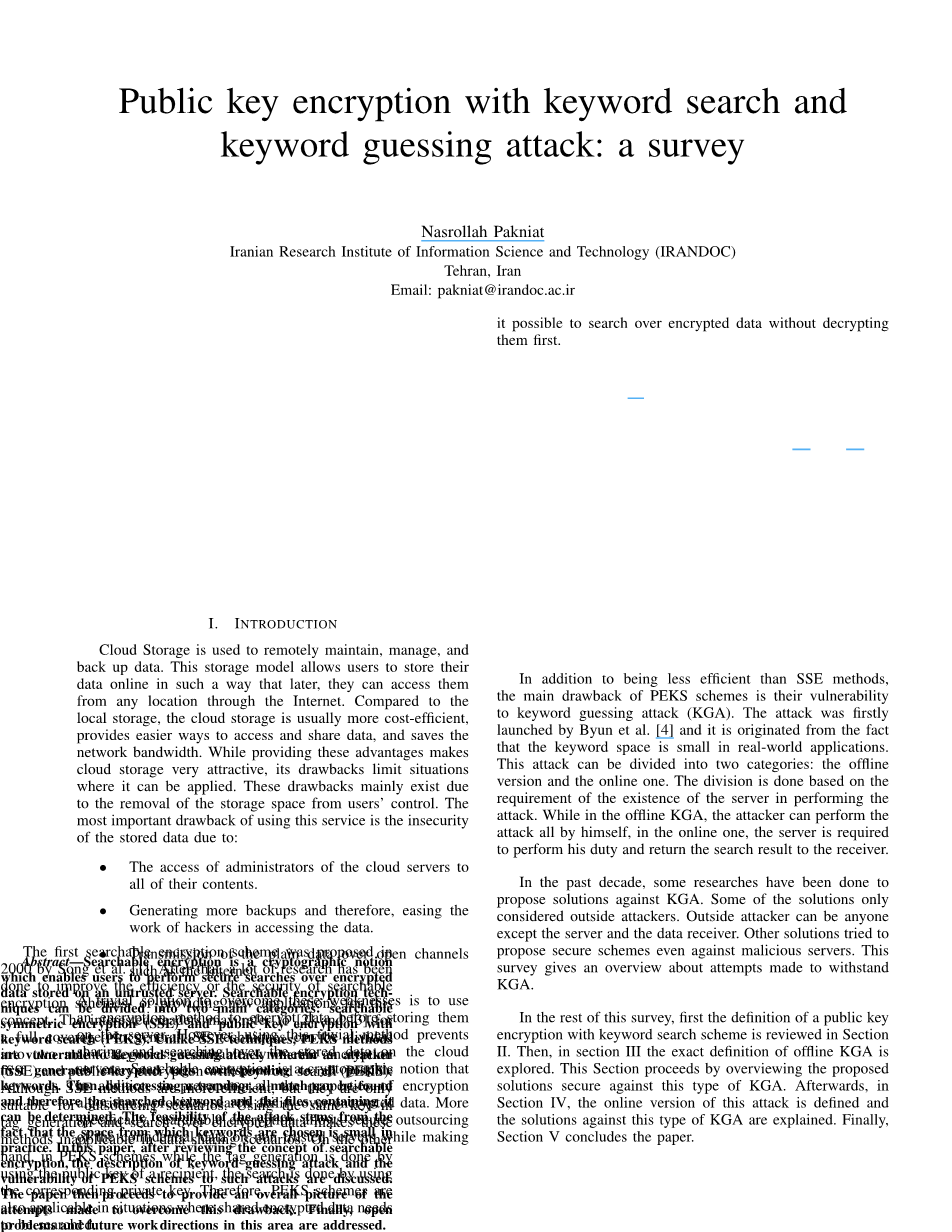 在本文中,首先在第二部分,回顾了使用关键词搜索进行公钥加密的定义。然后在第三部分中,探讨了离线KGA的确切定义。此部分概述了针对这种类型的KGA的安全解决方案。之后在第四部分中,定义了这种攻击的在线版本,并提出解释了针对这种类型的KGA的解决方案。最后第五部分总结全文。