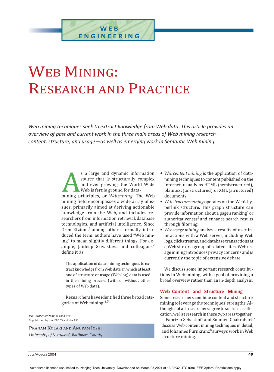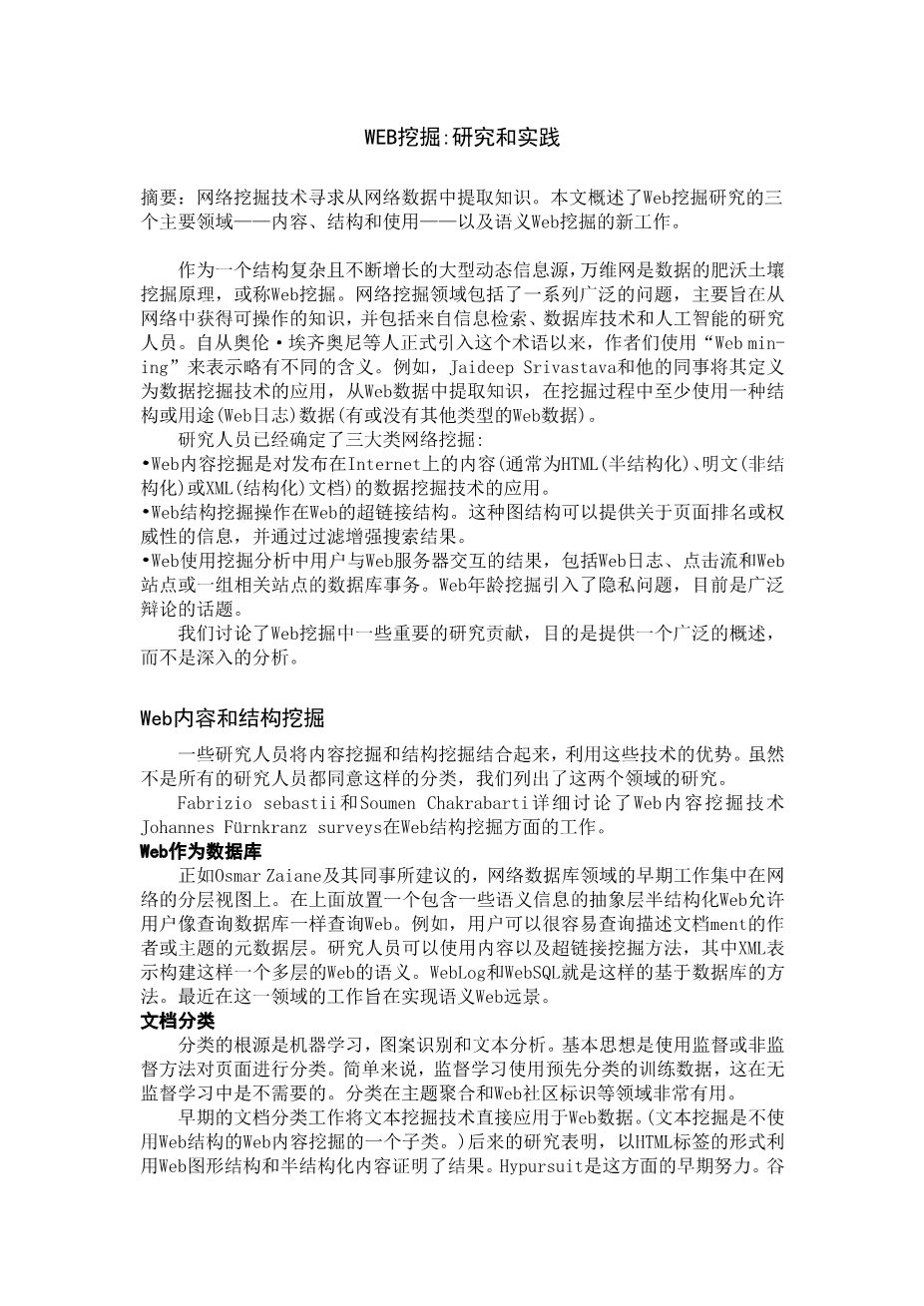 WEB挖掘:研究和实践外文翻译资料 2023-02-07 09:19:28 英语原文共 5 页,剩余内容已隐藏,支付完成后下载完整资料 英语译文共 5 页,剩余内容已隐藏,支付完成后下载完整资料 资料编号:[259336],资料为PDF文档或Word文档,PDF文档可免费转换为Word 您需要先支付 30元 才能查看全部内容!立即支付 发小红书推广免费获取该资料资格。点击链接进入获取推广文案即可: Ai一键组稿 | 降AI率 | 降重复率 | 论文一键排版 PREVIOUS NEXT 您可能感兴趣的文章 基于B/S架构的高校就业信息管理系统的设计与实现开题报告 基于scrapy爬虫技术的电商平台数据分析系统文献综述 基于热点查询的地理栅格数据分析算法研究文献综述 交通数据中的数据优化文献综述 气象云图数据的解析与展示组件的开发文献综述 圆形图章的配准与鉴别研究文献综述 基于SSM框架的博客系统文献综述 基于Python的药用菊花指标预测分析文献综述 塔吊脚手架网设计与开发(后台管理系统)文献综述 高校大学生创新能力培养大数据分析与平台设计文献综述