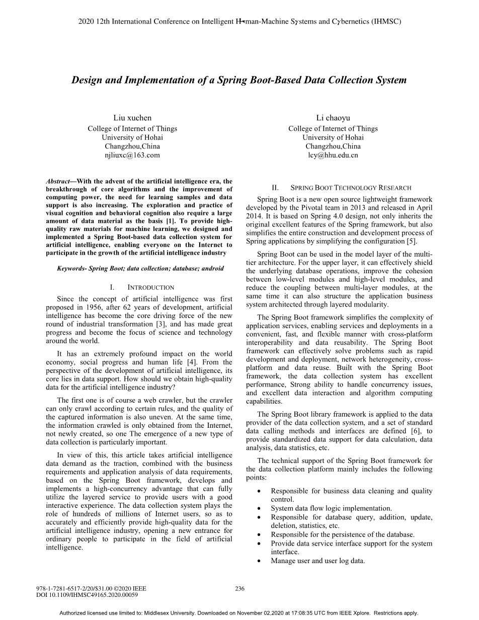 通过对Spring的研究,我们确定了Spring Boot开发的优势,结合当前时代的实际情况和当今数据采集的缺陷,设计了数据采集系统[139]。本文介绍了Spring-Boot框架的基本特点和概念,以及基于Spring-Boot的数据采集系统各功能模块的设计和具体实现方法。由此可见,Spring Boot框架的应用为数据采集系统提供了新的构建思路和手段,提高了为人工智能时代提供大量各种形式数据的能力。