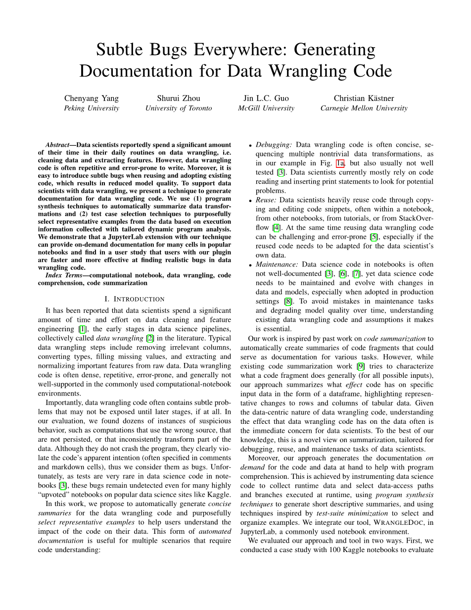 bull; 调试:数据整理代码通常很简洁,可以对多个重要的数据转换进行排序,如图-1a中的示例所示,但通常也没有经过很好的测试[3]。数据科学家目前主要依靠代码阅读和插入打印语句来寻找潜在问题。