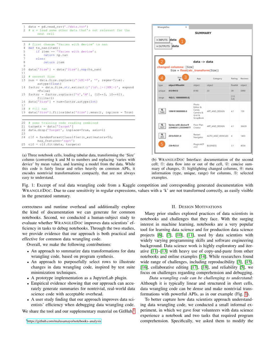 我们观察到我们的参与者用来理解数据争论代码的两种主要策略。一方面,他们经常对代码进行静态推理,逐行检查代码而不运行它。在这个过程中,他们经常离开notebook,根据需要查找所用数据科学库中众多函数的 API 文档和代码示例,例如提取和替换以及我们示例中的各种参数。另一方面,他们还通过观察执行情况进行动态推理。我们的参与者经常在单元格的开头和结尾或新单元格中注入打印语句,以检查数据样本(通常是前几行)并在数据整理步骤之前和之后手动比较它们。我们看到,在处理大量数据时,动态推理很快就会变得不堪重负和乏味,尤其是在触发有问题行为的数据不属于前几行的情况下。在我们的示例中(图1a) ,9360 行中的前五行包含以字母“M”结尾的大小并包含“Varied with device”的值,但不包含以“k”结尾的大小,这使得不正确k 结尾行的转换很难发现。