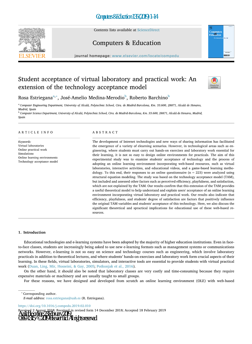 互联网技术的发展和信息共享的新方式促进了各种在线学习场景的出现。然而,在工程等技术领域,学生必须进行对学习至关重要的动手实践和实验室练习,设计在线实习环境并非易事。这项实验研究旨在探讨学生对技术的接受程度,以及采用在线学习环境的过程,该环境包括基于网络的资源,如虚拟实验室、互动活动和教学视频,以及基于游戏的学习方法。为此,使用结构方程模型分析了他们对在线问卷(n=223)的回答。该研究以技术接受模型(TAM)为基础,但包括并评估了TAM无法解释的其他因素,如感知效率、游戏性和满意度。我们的结果证实,TAM的这种扩展提供了一个有用的理论模型,能够帮助理解和解释用户对结合虚拟实验室和实际工作的在线学习环境的接受程度。我们的结果还表明,效率、游戏性和学生的满意度是正向影响原始TAM变量和学生对该技术接受度的因素。在这里,我们还讨论了这些基于网络的资源对教育使用的重要理论和实践意义。