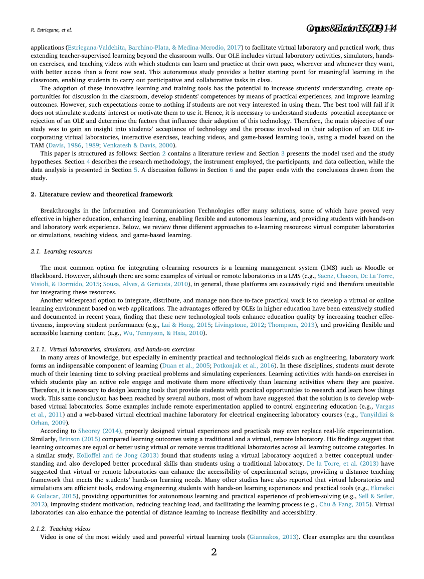 教学视频浓缩地说明了最相关的主题,而虚拟实验室、模拟和实践工作则强化了呈现的内容。在之前的研究中,我们评估了这种OLE的效率及其与学习的关系。因此在(Estriegana-Valdehita et al.,2017)中我们说,它的使用促进了一种积极的学习方法,并对OLE学习环境本身及其在课堂上启用的积极学习策略产生了毫无疑问的积极体验和欣赏,提高了学习成绩和成绩。此外关于,在(Estriegana,MedinaMerodioamp;Barchino,2019)中,我们报告说OLE与能力获得和测量的学习结果呈正相关。