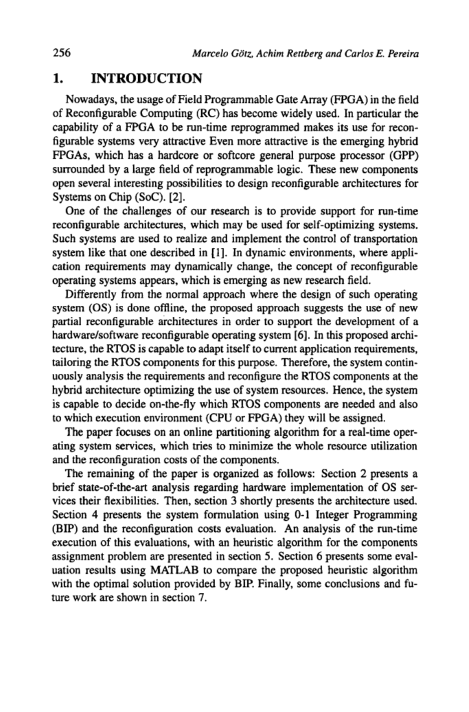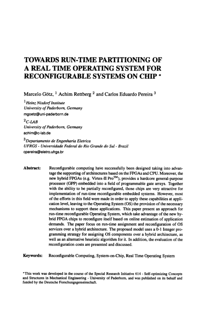 摘要: 利用基于FPGA和CPU的体系结构的支持,成功设计了可重构计算。此外,新的混合 FPGA(例如 Virtex-ll ProTM)提供了嵌入可编程门阵列领域的硬核通用处理器 (GPP)。连同部分重新配置的能力,这些芯片对于实现运行时可重新配置的嵌入式系统非常有吸引力。然而,该领域的大部分努力都是为了在应用程序级别应用这些功能,而留给操作系统 (OS) 提供必要的机制来支持这些应用程序。本文提出了一种运行时可重构操作系统的方法,该方法利用新的混合FPGA芯片基于应用需求的在线估计来重构自身。本文重点介绍混合架构上操作系统服务的运行时分配和重新配置。所提出的模型使用 0-1 整数编程策略来分配混合架构上的 OS 组件,以及对其的替代启发式算法。此外,还介绍并讨论了对重新配置成本的评估。