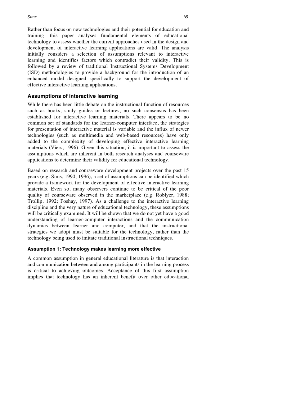 接受这一假设意味着可以开发能够响应学习者个人需求的课件,这是对技术的理想使用。Jonassen (1988:202)认为,“交互式技术的力量... ... 在于它们能够以更有意义的方式适应教学”,Ross amp; Morrison (1988:227)声称,“计算机最强大的能力之一在于适应学生的教学”。然而,正如 sim (1997)所指出的那样,互动的力量还有待完全探索。