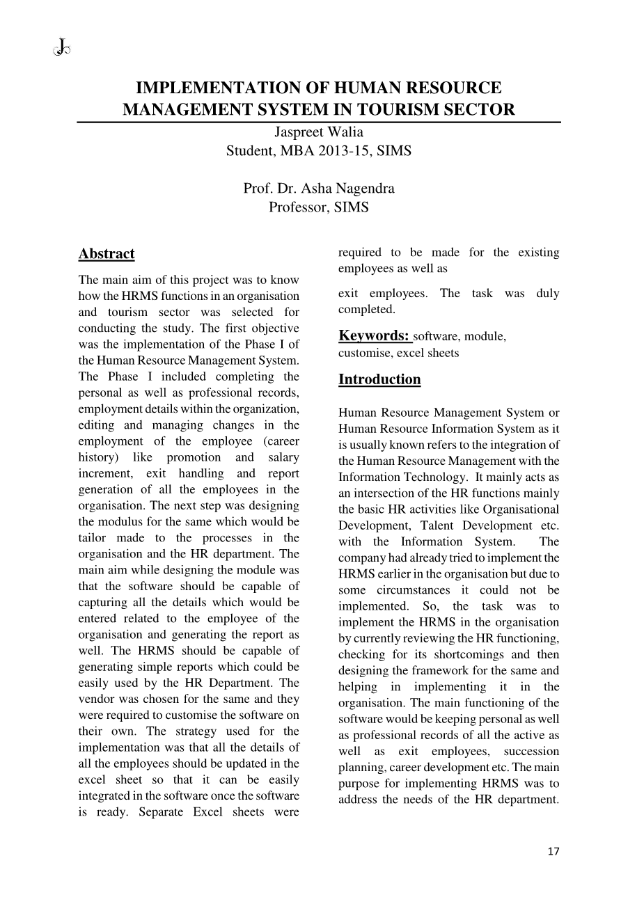 The main aim of this project was to know how the HRMS functions in an organisation and tourism sector was selected for conducting the study. The first objective was the implementation of the Phase I of the Human Resource Management System. The Phase I included completing the personal as well as professional records, employment details within the organization, editing and managing changes in the employment of the employee (career history) like promotion and salary increment, exit handling and report generation of all the employees in the organisation. The ne