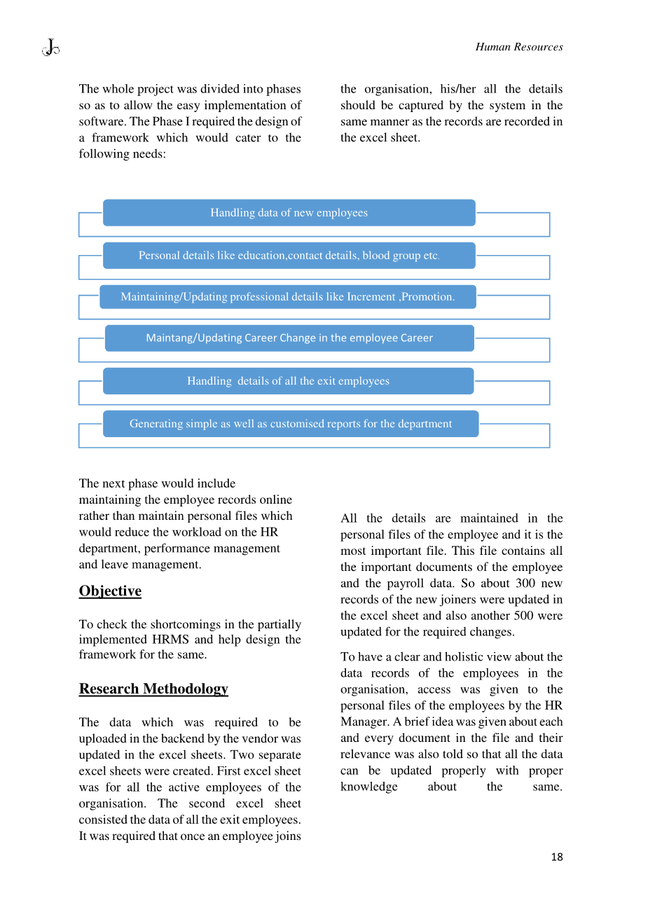 本项目的主要目的是了解人力资源管理系统在组织和旅游部门中的作用,并选择其进行研究。第一个目标是实施人力资源管理系统第一阶段。第一阶段包括完成个人和专业记录、组织内的雇佣详情、编辑和管理员工雇佣(职业历史)的变化,如晋升和加薪、离职处理和组织内所有员工的报告生成。下一步是为同样的模块设计模块,该模块将根据组织和人力资源部门的流程进行定制。设计模块时的主要目的是,软件应能够捕获与组织员工相关的所有详细信息,并生成报告。人力资源管理系统应能够生成简单的报告,便于人力资源部门使用。选择供应商也是出于同样的目的,他们需要自己定制软件。用于实施的策略是,所有员工的所有详细信息都应在excel表中更新,以便在软件准备就绪后可以轻松地集成到软件中。需要为现有员工和离职员工制作单独的excel表格。任务如期完成。