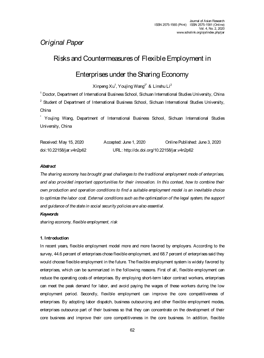 总的来说,在共享经济中,企业越来越倾向于灵活的雇佣员工,这也带来了越来越多的风险。例如,在灵活用工的过程中,企业与工人之间经常发生纠纷。然而,灵活就业的法律保护体系还不够健全,法律层面倾向于保护劳动者,增加了企业在灵活就业过程中的法律风险。另外,企业由于不仅劳动者不是一个企业的正式员工,而且工作时间、工作地点、工作的形式等等都体现了灵活性的特点,出于节省成本的培训和管理,大多数企业会错误地选择灵活用工的培训和管理制度,导致企业在招聘时存在不规范的风险。此外,由于我国原有的劳动关系是用规范用工的方式来界定的,企业在灵活用工的过程中不得不承担与劳动者劳动关系不明确的风险。因此,为了更好的规避灵活就业过程中的风险,更有必要对其进行及时的分析和研究,并找出相应的对策。