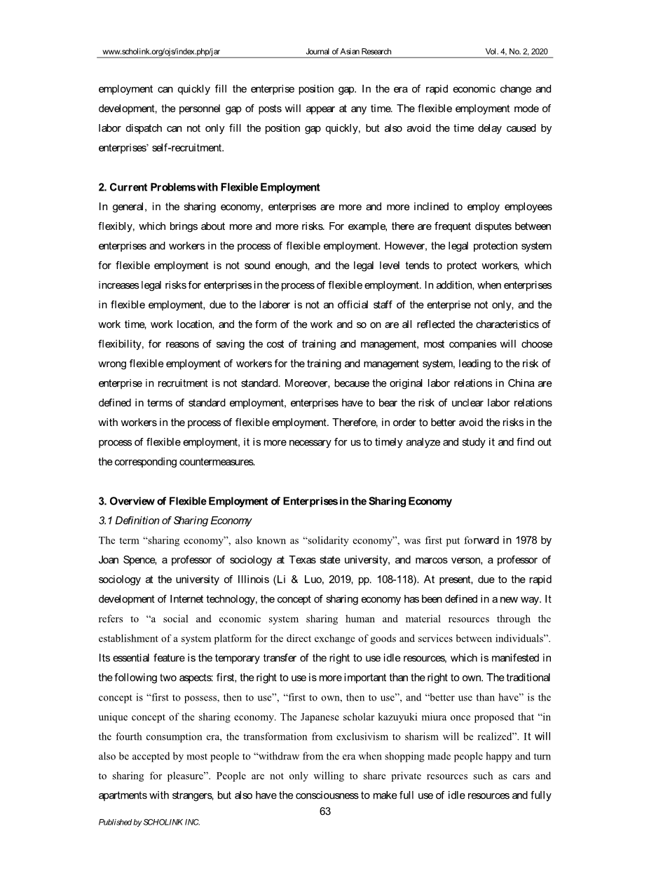 “共享经济”一词,又称“团结经济”,是由得克萨斯州立大学社会学教授琼·斯彭斯和伊利诺伊州立大学社会学教授马科斯·弗森于1978年首次提出的(Li amp; Luo,2019,pp.108-118)。当前,由于互联网技术的快速发展,共享经济的概念被重新定义。它是指“通过建立个人之间直接交换商品和服务的系统平台,实现人力和物质资源共享的社会经济体系”。其本质特征是闲置资源使用权的临时转移,表现在以下两个方面:一是使用权比所有权更重要。传统观念是“先占有后使用”、“先拥有后使用”,“用胜于用”是共享经济的独特理念。日本学者三浦和雪曾经提出,“在第四次消费时代,将实现从排他主义到分享主义的转变”。“退出购物让人快乐的时代,转向分享愉悦的时代”也将被大多数人所接受。人们不仅愿意与陌生人共享私人资源,如汽车和公寓,而且有充分利用闲置资源的意识和充分展示其使用价值,从而实现社会的最大效率。二是灵活就业,《福布斯》的封面故事称:“分享经济是一场前所未有的革命,正悄然将数百万人转变为兼职企业家。”分享经济的背景下,就业模式总体上是非常灵活,具有较强的自我控制能力在工作时间、工作地点和工作方法,使大量的员工可以灵活地进行适合他们的工作根据自己的意志和专业知识,以获得满意的报酬。