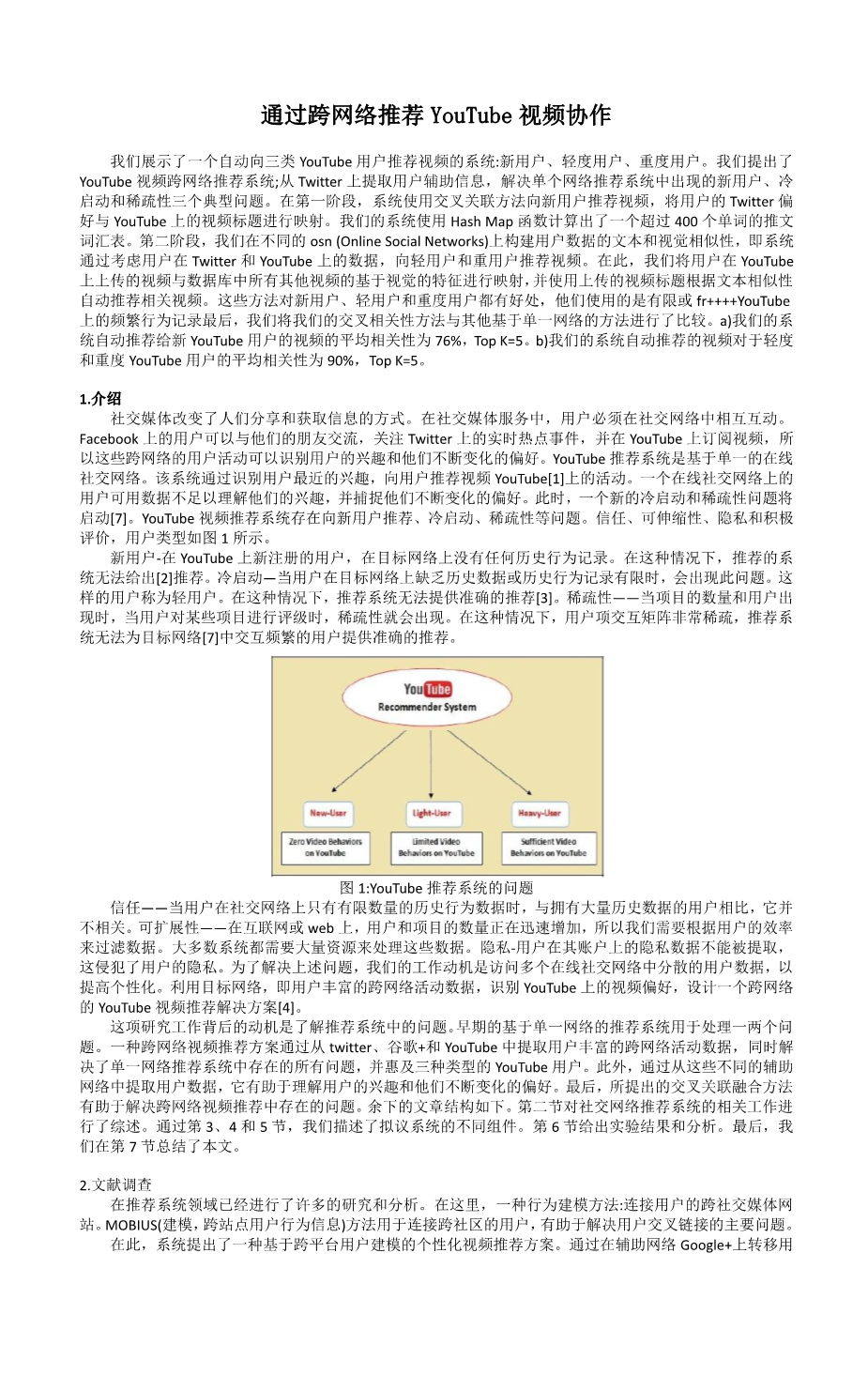 通过跨网络推荐YouTube视频协作外文翻译资料 2023-04-06 09:29:12 英语原文共 9 页,剩余内容已隐藏,支付完成后下载完整资料 英语译文共 9 页,剩余内容已隐藏,支付完成后下载完整资料 资料编号:[590399],资料为PDF文档或Word文档,PDF文档可免费转换为Word 您需要先支付 30元 才能查看全部内容!立即支付 发小红书推广免费获取该资料资格。点击链接进入获取推广文案即可: Ai一键组稿 | 降AI率 | 降重复率 | 论文一键排版 PREVIOUS NEXT 您可能感兴趣的文章 基于B/S架构的高校就业信息管理系统的设计与实现开题报告 基于scrapy爬虫技术的电商平台数据分析系统文献综述 基于热点查询的地理栅格数据分析算法研究文献综述 交通数据中的数据优化文献综述 气象云图数据的解析与展示组件的开发文献综述 圆形图章的配准与鉴别研究文献综述 基于SSM框架的博客系统文献综述 基于Python的药用菊花指标预测分析文献综述 塔吊脚手架网设计与开发(后台管理系统)文献综述 高校大学生创新能力培养大数据分析与平台设计文献综述