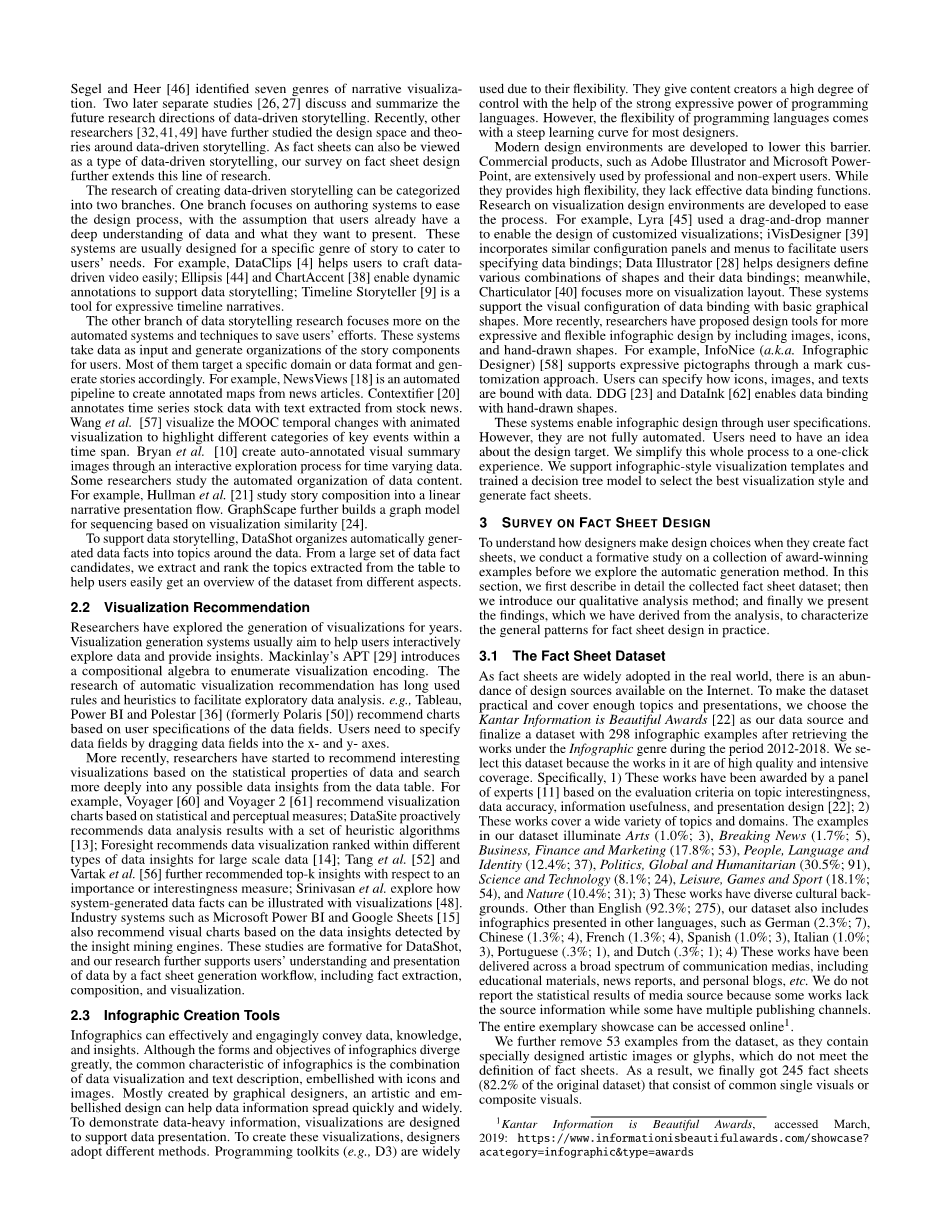 然而,事实表的创建并不容易。它需要两种完全不同的专业知识,即数据分析和图形设计。一方面,事实表需要内容丰富、有趣、发人深省、有见地和可靠[22]. 要撰写资料单,用户需要探索数据,找到重要的数据事实,并将其组织成有趣的数据故事,这对大多数用户来说要求很高且负担很重。抓住这个机会,Power BI 等商业工具[2] 和谷歌表格[1] 引入了功能,通过自动推荐数据事实来帮助用户立即获得洞察力。但是,这些工具生成的数据事实没有逻辑联系,用户对数据的全貌一无所知。因此,他们仍然需要检查整个建议库以提炼出有意义的故事。另一方面,一份好的数据资料表不仅要内容丰富、有趣,还要美观。要创建概况介绍,Adobe Illustrator 等设计工具是专业设计师的常见选择。最近,研究人员改进了设计环境,以简化灵活和富有表现力的数据驱动信息图表的创建,例如 DDG[23], 数据插画师[28], 宪章者[40], 和 InfoNice[58]. 尽管这些工具或多或少地简化了数据绑定和编辑图形形状的过程,但用户仍然需要花费大量时间来自主考虑事实表的内容和设计选择,并通过反复试验手动进行数据绑定。错误。