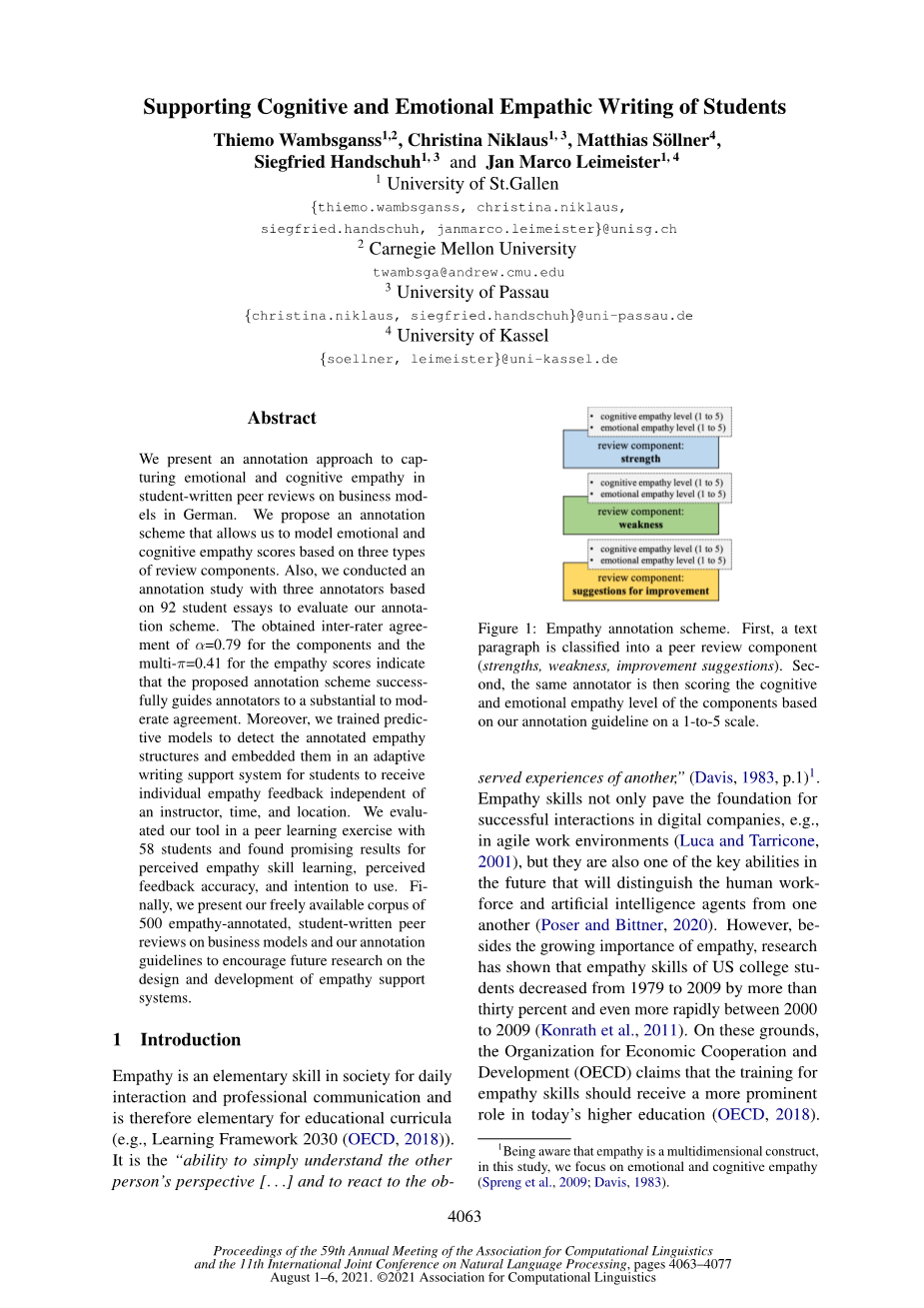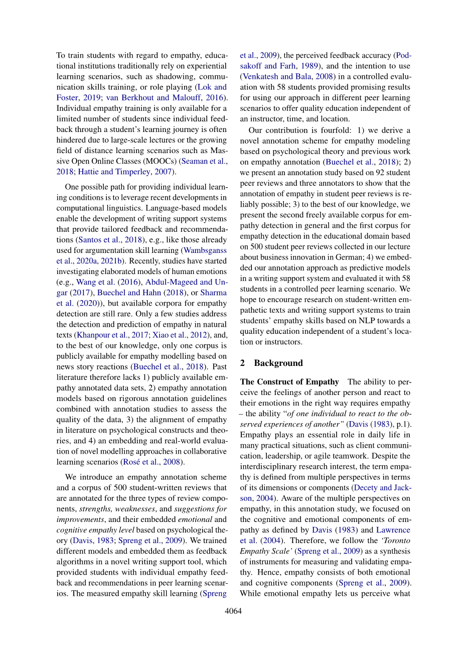 我们的贡献有四个方面:1)基于心理学理论和先前的共情注释工作,我们推导出一种新的共情建模注释方案(Buechel等人,2018);2)基于92篇学生互评和3个注释器的注释研究表明,学生互评中的共情注释是可靠可行的;3)据我们所知,基于我们在德国商业创新讲座中收集的500篇学生同行评论,我们提出了第二个可免费获得的一般共情检测语料库和第一个教育领域共情检测语料库;4)我们将我们的注释方法作为预测模型嵌入到写作支持系统中,并在受控的同伴学习场景中对58名学生进行了评估。我们希望鼓励对学生写作的共情文本和写作支持系统的研究,以培养学生基于NLP的共情技能,从而实现独立于学生所在地或教师的优质教育。
