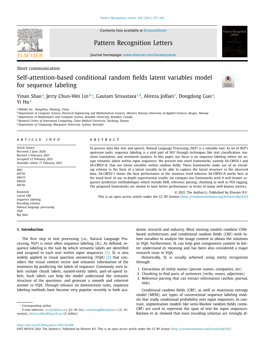 为了处理文本和语音等数据,自然语言处理(NLP)是一个有价值的工具。在NLP的上游任务中,通过文本分类、机器翻译和情感分析来序列标签的技术成为NLP的重要组成部分。在本文中,我们的重点是序列标签,我们在输入序列中标记语义标签。我们提出了两个新框架,即SA-CRFLV-I 和 SA-CRFLV-II,这会在随机场中使用潜在变量,这些变量利用潜在变量形式的编码模式来捕捉观察数据中的潜在结构。SA-CRFLV-I 在句子层面表现最好,而 SA-CRFLV-II 在单词层面表现最好。在我们深入实验结果中,我们将我们的框架与 4 种众所周知的序列预测方法进行了比较,其中包括 NER、引用解析、分块以及 POS 标记。我们所提出的框架在许多众所周知的指标方面表现出更好的性能。