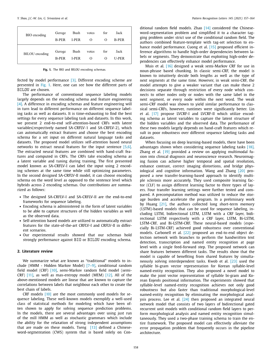 当专注于基于深度学习的模型时,在考虑序列标记任务时已经显示出优势 [18]。Zhang 等人。 [19] 对将多模式融合应用于临床诊断和神经科学研究进行了综述。神经影像融合可以实现更高的时空分辨率,增强对比度,纠正影像失真,并弥合生理和认知信息。 Wang 和 Zhang [20] 提出了一种新的基于迁移学习的方法来更准确地识别多发性硬化症。他们使用复合学习因子(CLF)将不同的学习因子分配给三种类型的层。进一步测试和比较了四种迁移学习设置。使用预计算方法来减少存储负担并加速程序。在 Huang [21] 的初步工作中,作者收集了可用于序列标记的基于长短期记忆 (LSTM) 的模型,包括 LSTM、双向 LSTM、带有 CRF 层的 LSTM、双向 LSTM分别具有 CRF 层、LSTM、Bi-LSTM、LSTM-CRF 和 Bi-LSTM-CRF。这些基于神经的模型(尤其是 Bi-LSTM-CRF)与传统模型相比具有良好的鲁棒性。卡内尔等人。 [22] 提出了一个带有分支的端到端对象检测网络,通过单个前馈步骤在页面级别执行手写文本检测、转录和命名实体识别。所提出的网络可以在不同任务之间共享特征。结果表明,该模型能够通过同时解决相互依赖的任务来受益于共享特征。克沃布等人。 [23] 使用音节二元向量表示进行韩语音节级命名实体识别。他们还提出了一种新颖的模型来制作音节bi-gram和韩国Eojeols位置信息的联合向量表示。实验表明,音节级命名实体识别不仅具有良好的鲁棒性,而且通过消除形态分析过程,比传统的形态级命名实体识别速度更快。李等人。 [24] 然后提出了一种集成神经网络模型,该模型由两层双向门控循环单元模型和条件随机场层组成,以同时执行形态分析和命名实体识别。他们使用两阶段训练模式来训练整个框架。所提出的模型可以有效缓解流水线架构中经常出现的错误传播问题。
