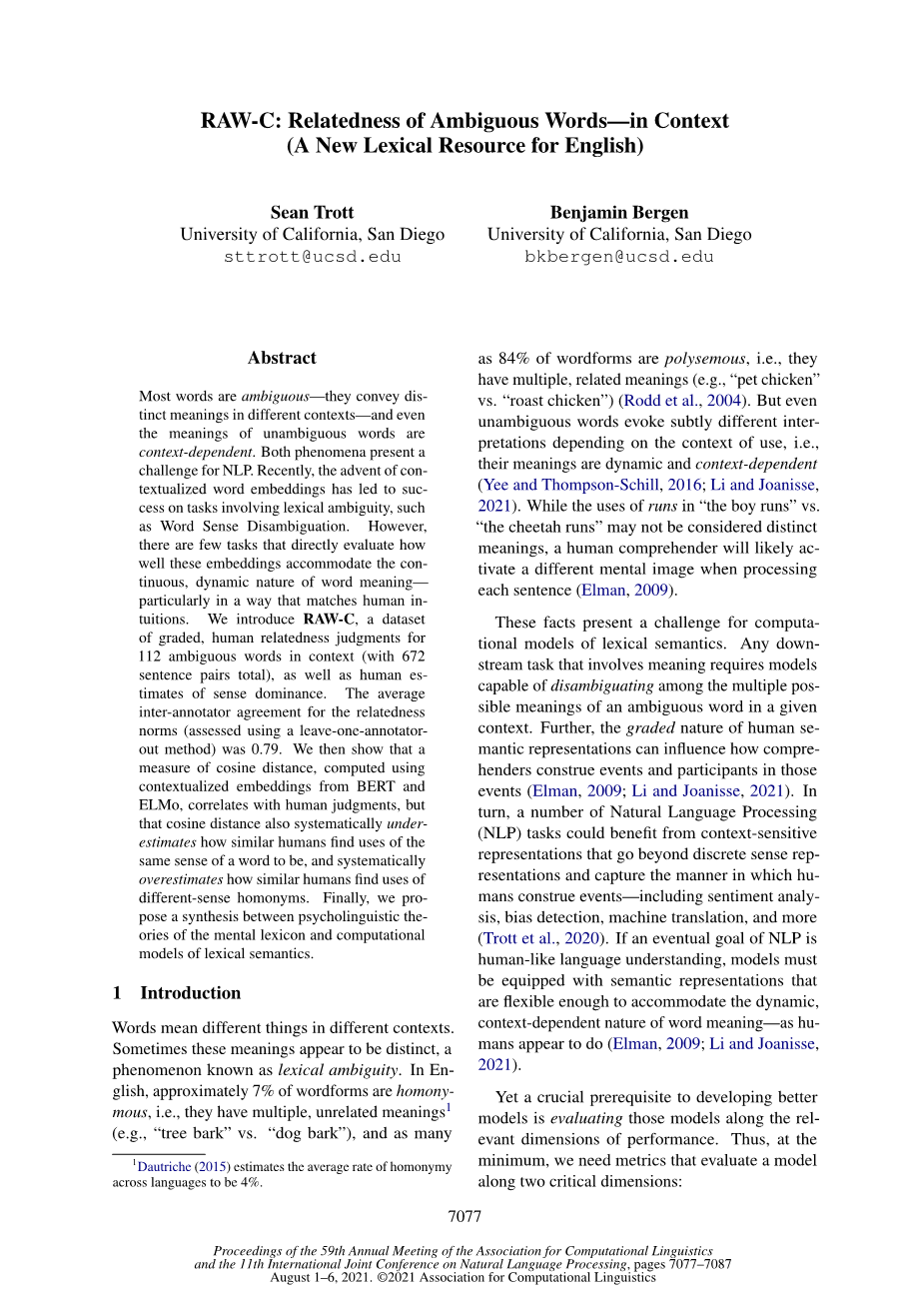 大多数单词都是模糊的——它们在不同的上下文中表达不同的意思——甚至明确的单词的意思也是依赖于上下文的。这两种现象都对NLP提出了挑战。最近,语境化单词嵌入的出现已经促成了涉及词汇歧义的任务的成功,例如词义消歧。然而,很少有任务直接评估这些嵌入在多大程度上适应了词义的连续、动态性质——特别是以符合人类直觉的方式。我们引入RAW-C,一个对上下文中112个歧义词(总共672个句子对)进行分级的人类相关性判断的数据集,以及人类对意义优势的估计。注释者之间对于相关度标准的平均一致度(使用保留一个注释者的方法评估)是0.79。然后,我们表明,使用BERT和ELMo的语境化嵌入计算的余弦距离度量与人类判断相关,但余弦距离也系统地低估了相似人类如何找到相同词义的用法,并系统地高估了相似人类如何找到不同词义同音异义词的用法。最后,我们提出心理词汇的心理语言学理论和词汇语义学的计算模型之间的综合。