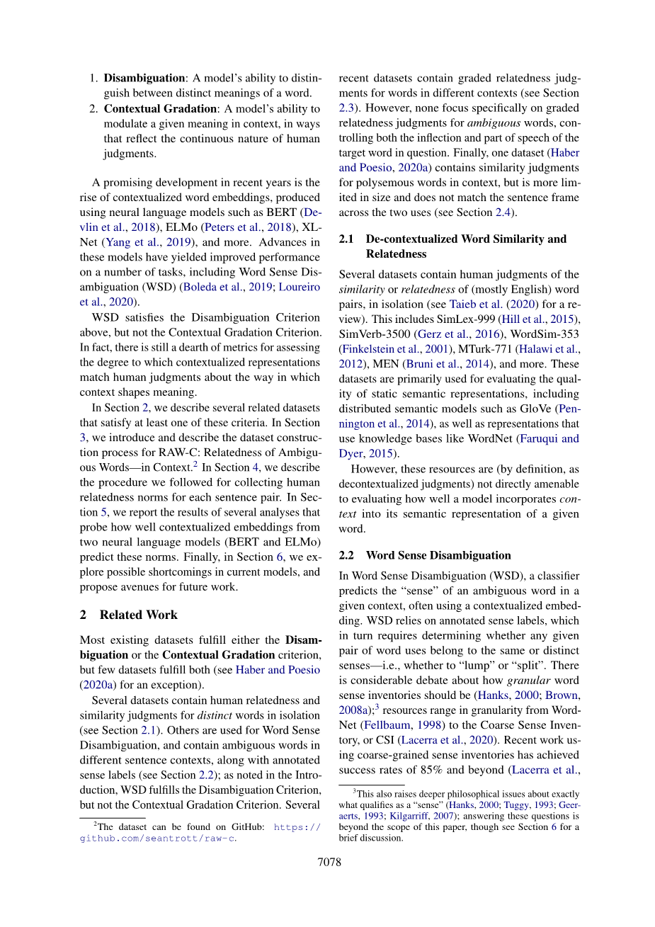 一些数据集包含单独的不同单词的人类相关性和相似性判断(见第2.1节)。另一些用于词义消歧,包含不同句子上下文中的歧义词,以及带注释的词义标签(参见第2.2节);正如引言中所指出的,词义消歧符合消歧标准,但不符合语境等级标准。几个最近的数据集包含不同上下文中单词的分级相关度判断(参见第2.3节)。然而,没有一个专门关注模糊词的等级关系判断,控制目标词的词形变化和词性。最后,一个数据集(Haberand Poesio,2020a)包含对上下文中多义词的相似性判断,但是在大小上更受限制,并且与两种用法中的句子框架不匹配(参见2.4)。