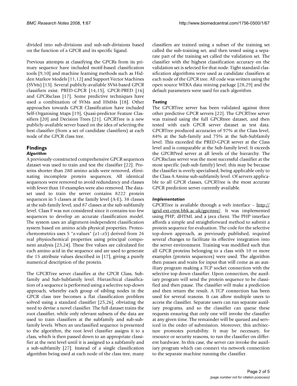 GPCRTree可以通过一个web界面获得——http://igrid-ext.cryst.bbk.ac.uk/gpcrtree/。它是用PHP、dHTML和java客户端实现的。PHP接口提供了一种简单而直接的方法来提交用于评估的蛋白质序列。如之前所说,选择性自顶向下方法的代码需要进行一些更改,以方便有效地集成到服务器环境中。对训练进行修改,使所有属于具有10个或更多实例(蛋白序列)的一类的GPCR蛋白都被使用。然后,算法暂停并等待输入,这些输入将作为一个辅助程序与选择性自顶向下分类器建立TCP套接字连接。连接后,辅助程序将待分类的蛋白序列发送出去,然后暂停。分类器将进行预测,然后返回结果。使用TCP连接有几个原因。它可以允许多个用户访问分类器。单独的用户可以运行单独的辅助程序,因此分类器可以对这些请求进行排队,以确保在任何给定的时间只有一个请求会调用分类器。其余的将按照提交的顺序排队和服务。此外,这种架构促进了可移植性。出于资源或安全原因,可能需要在不同的硬件上运行分类器。在这种情况下,服务器可以调用辅助程序,该辅助程序可以通过网络连接到运行分类器的独立机器。
