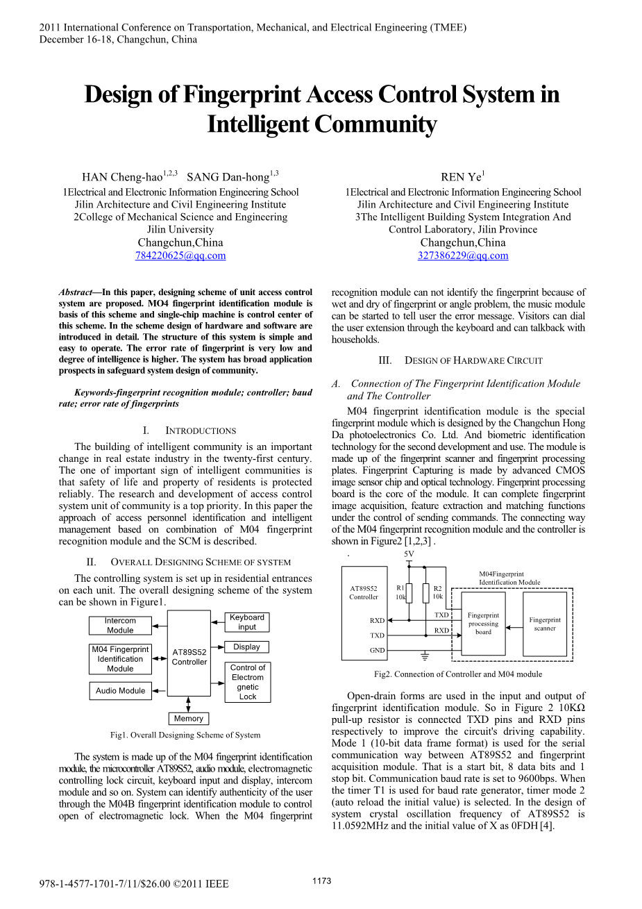 本文基于区单元M04指纹门禁模块对硬件和软件进行了设计。 经过测试指纹采集和系统的指纹匹配时间很短(一般小于0.5秒),指纹误码率小于万分之一,整体性能稳定。 在智能社区安全系统的设计中具有广泛的应用前景。
