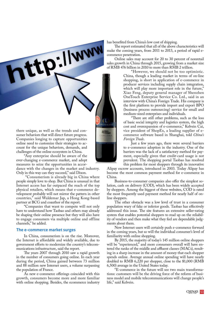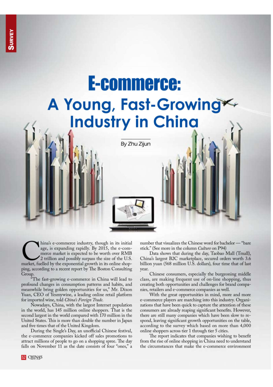 著名的葡萄酒在线销售平台也买网的首席执行官迪克森元先生,他是这样描述中国的对外贸易的:“中国快速增长的电子商务将造成消费模式和消费习惯的深刻改变,同时也为我们带来黄金发展机会。”