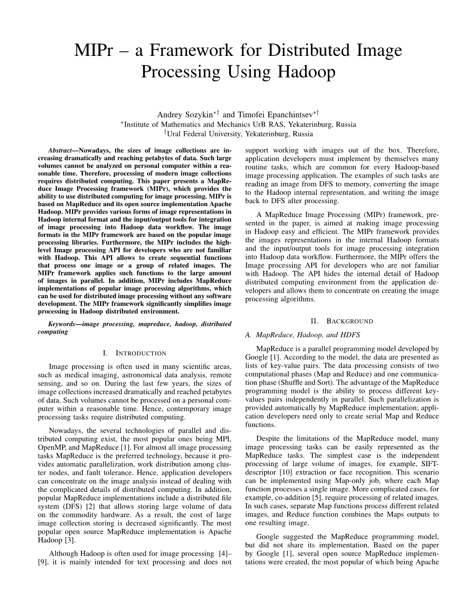 MIPr 是我们的MapReduce图像处理框架,旨在为图像处理提供简单和方便的方式。MIPr允许开发人员用熟悉的工具并行处理大量的图像,而无需学习分布式计算的细节。