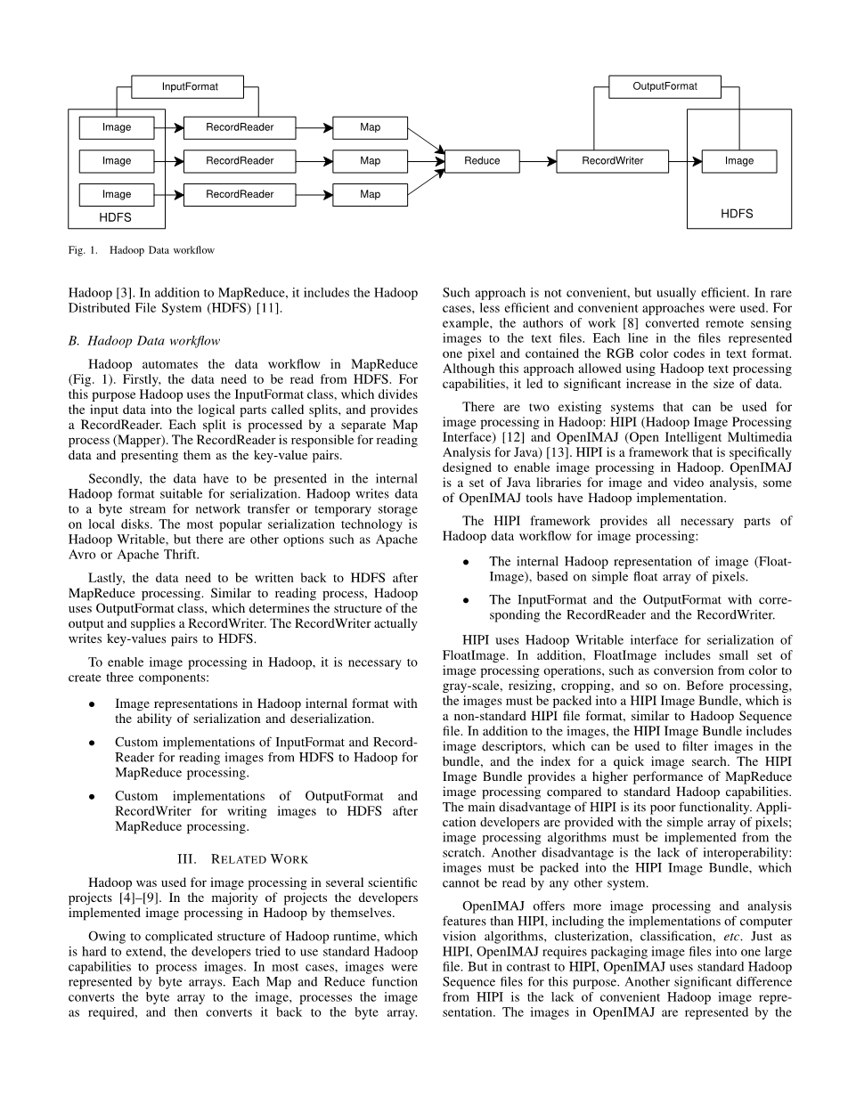 Hadoop运行时由于结构复杂,难以扩展,开发人员试图使用基础Hadoop能力来处理图像。在大多数情况下,图像表示为字节数组,每个Map和Reduce函数将字节数组转换为图像处理所需的图像,然后将其转换回字节数组。