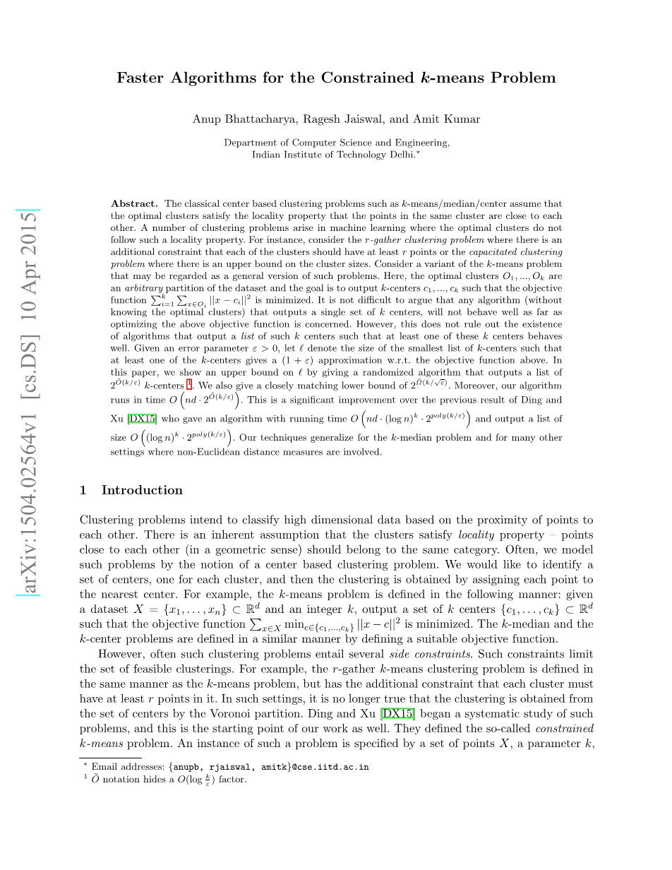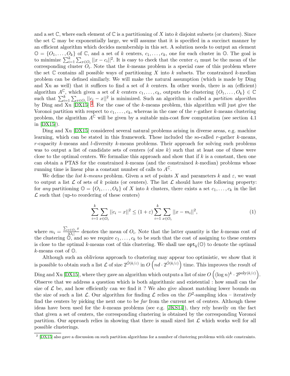然而,这类聚类问题通常需要几个方面的约束。这样的约束限制了可行集群的集合。例如,r-gather k-means集群问题的定义方法与k-means问题相同,但是有一个额外的约束,即每个集群中必须至少有r个点。在这样的设置中,不再是通过Voronoi分区从中心集获得集群。丁和徐[DX15]对这些问题进行了系统的研究,这也是我们工作的出发点。他们定义了所谓的约束k均值问题。这类问题的一个实例由一组点X指定,一个参数k,集合C,其中C的每个元素都是将X分割成k个不相交子集(或簇)由于集合C可能是指数级大的,所以我们假设它是由一个有效的算法以一种简洁的方式指定的,该算法决定了这个集合的成员。一个解决方案需要输出一个元素O = {O1,hellip;和一组k个中心,c1,hellip;, ck, o中的每个簇对应一个,目标是最小化Pk i = 1Pxisin;Oi | | xminus;ci | | 2。很容易检查,中心ci必须是的平均值相应的集群Oi。注意,k-均值问题是这个问题的一个特例,其中集合C包含将X划分为k个子集的所有可能方法。约束k中值问题可以用类似的方法定义。我们将做一个自然的假设(丁和徐也是这样做的),即找到一组k个中心就足够了。换句话说,有一个(有效的)算法AC,它给出了一组以k为中心的c1,hellip;, ck,输出聚类{O1,hellip;, Ok}isin;C,使得Pk i = 1Pxisin;Oi ||ci - x||2最小。这种算法称为分区算法,由丁和徐[DX15] 2。对于k-均值问题,该算法将给出Voronoi对c1的分区,hellip;,而对于r-gather k-means聚类问题,算法AC将通过合适的最小代价流计算给出(见[DX15]第4.1节)。