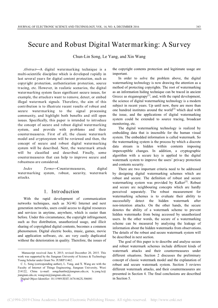 摘要:数字水印技术是近年来迅速发展起来的一门多学科的数字内容保护技术,如版权保护、认证保护、源跟踪等。然而,在现实场景中,数字水印系统面临着重要的安全问题,例如,攻击者想要删除、检测或嵌入非法水印信号。因此,这篇文献的目的是向信号处理界说明鲁棒性和安全性水印的最新研究结果,并突出优点和仍然存在的问题。具体地,本文介绍了安全可靠的数字水印系统的概念,并提出了存在的问题和对策。首先回顾了经典水印模型和密码体制,然后阐述了安全可靠的数字水印系统的概念。接下来,将对水印攻击进行分类和描述。最后,提出了一些提高安全性和鲁棒性的对策。