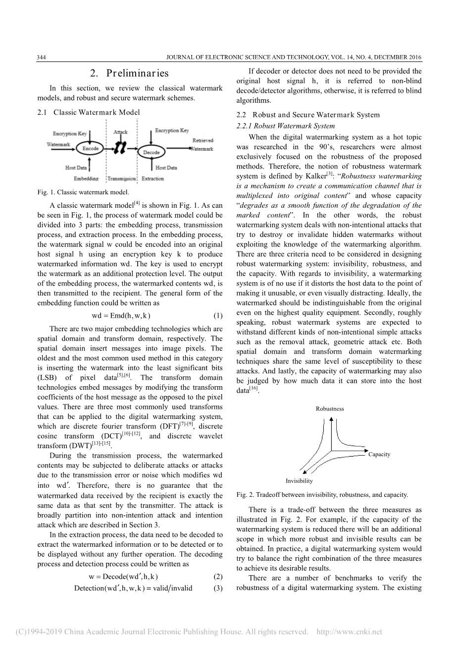 90年代,数字水印系统作为一个研究热点,研究者几乎只关注于所提出方法的鲁棒性。因此,鲁棒性水印系统的概念由Kalker[3]定义:“稳健性水印是一种创建多路复用到原始内容的通信信道的机制。”其容量“作为标记内容降解的平滑函数而退化”。换句话说,鲁棒水印系统是在不利用水印算法知识的情况下,对试图破坏或使隐藏水印失效的非故意攻击进行处理的。在设计鲁棒水印系统时,需要考虑三个标准:不可见性、鲁棒性和容量。在不可见性方面,如果水印系统将主机数据扭曲到使其不可用的程度,甚至在视觉上分散注意力,那么它就没有用处。理想情况下,即使在最高质量的设备上,水印也应该与原始水印不可区分。其次,粗略地说,鲁棒水印系统可以抵御各种非故意的简单攻击,如删除攻击、几何攻击等。空间域和变换域水印技术都具有相同的攻击敏感性。最后,水印的容量也可以通过它可以存储到主机数据中的数据量来判断[16]
