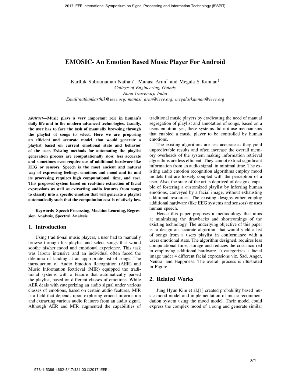 Jung Hyun Kim等人[1]使用情绪模型创建基于概率的音乐情绪模型和音乐推荐系统的实现。他们的模型可以表达一首歌的复杂情绪并产生类似的情感多个输入,情绪标签,歌曲和价值唤醒值的歌曲列表。他们的模型存在问题,难以对情绪标签进行分类和表达,或者在价值 - 觉醒平面中表达一个区域,不同的人在听完相同的歌曲后感觉不同,他们没有考虑音乐情绪模型的个性化和情绪转变的追踪。用户。Galen Chuang等人[2]创造了EmotiSphere,这是一种基于互动传感器的乐器,可根据用户j当前的情绪状态生成音乐。该仪器将通过电流皮肤传感器和脉冲传感器收集的情感生理标记转换为声光组合。用户将手放在球体上以开始记录并立即听到结果。[2]提出的方法是昂贵的,需要时间来构建球体。W. Amelia等人[3]创造了一种混合方法,它使用关键词定位技术和基于学习的方法相结合。情绪识别基于Paul Ekmanj的基本情绪,即愤怒,厌恶,恐惧,快乐,悲伤和惊奇。学习基于三种算法,包括多项Logistic回归,支持向量机(SVM)和朴素贝叶斯多项式。这里输入是一个短篇小说,系统决定读者会引起什么样的情绪。该技术使用多种学习方法来推断情绪,从而制作模型