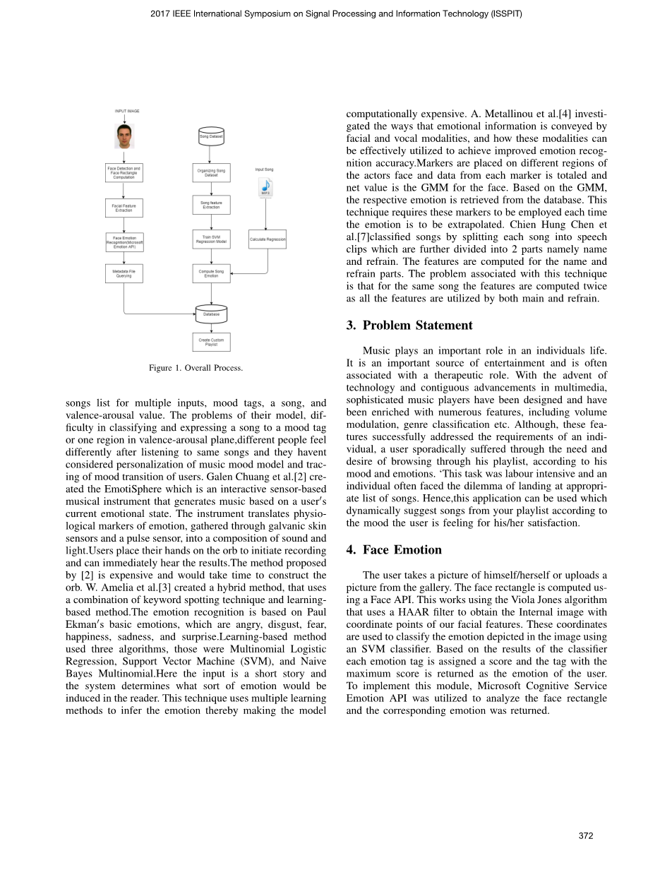 现有算法不太准确,因为它们产生不可预测的结果,并且经常增加系统的总体存储器开销,使得信息检索算法效率较低。它们无法在最短的时间内从音频信号中提取重要信息。现有的音频情感识别算法采用与用户的感知松散耦合的情绪模型。此外,现有技术被剥夺了设计,能够通过推断由面部图像传达的人类情感来培养定制的播放列表,而不会耗尽额外的资源。现有设计要么使用额外的硬件(如EEG系统和传感器),要么使用人类语音。