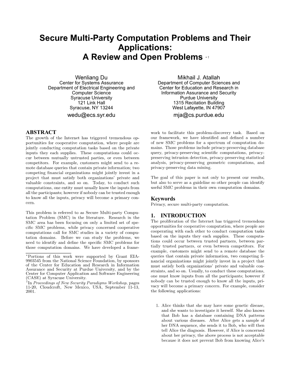 这个问题在文献中被称为安全多方计算问题(SMC)。 SMC领域的研究一直专注于一组有限的特定SMC问题,而在各个计算领域中,涉及隐私的协作计算需要进行SMC研究。 在我们研究问题之前,我们需要识别和定义这些计算域中特定的SMC问题。 我们已经开发了一个框架来解决问题探索这项任务。 基于我们的框架,我们已经在一系列计算域中识别和定义了许多新的SMC问题。 这些问题包括隐私保护数据库查询,隐私保护科学计算,隐私保持入侵检测,隐私保留统计分析,隐私保留几何计算和隐私保护数据挖掘。