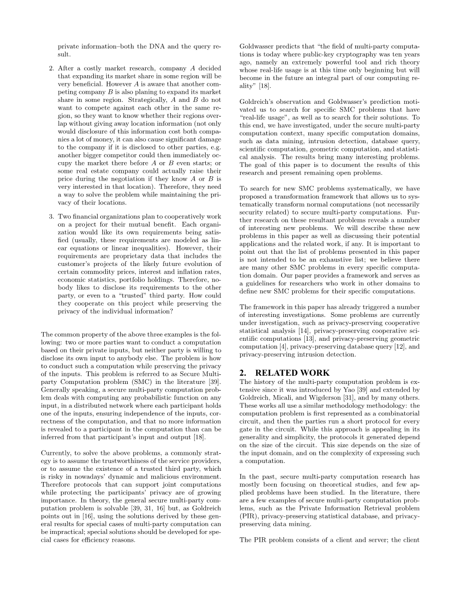 除了上述问题,安全多方计算问题也存在于许多其他计算领域中,其中大多数没有被研究过。如果我们将隐私问题与在特定计算域中的协作计算相结合,则出现一些新问题。 本文的目的是记录我们如何识别这些问题及其定义。我们希望激励更多的人来思考这些问题。 本文的作者已经研究了这些问题中的一些[12,13,14,4]。