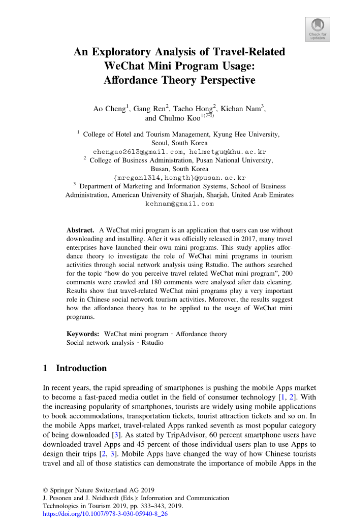 摘要:微信小程序是用户无需下载和安装即可使用的应用程序。在2017年正式发布后,许多旅游企业都推出了自己的小程序。本研究利用Rstudio的社会网络分析方法,运用支付理论探讨微信小程序在旅游活动中的作用。作者以“你如何看待旅游相关微信小程序”为主题,对200条评论进行了爬虫,对180条评论进行了数据清理分析。结果表明,与旅游相关的微信小程序在中国社交网络旅游活动中起着非常重要的作用。此外,研究结果还表明,在微信小程序的使用中,如何应用支付理论。