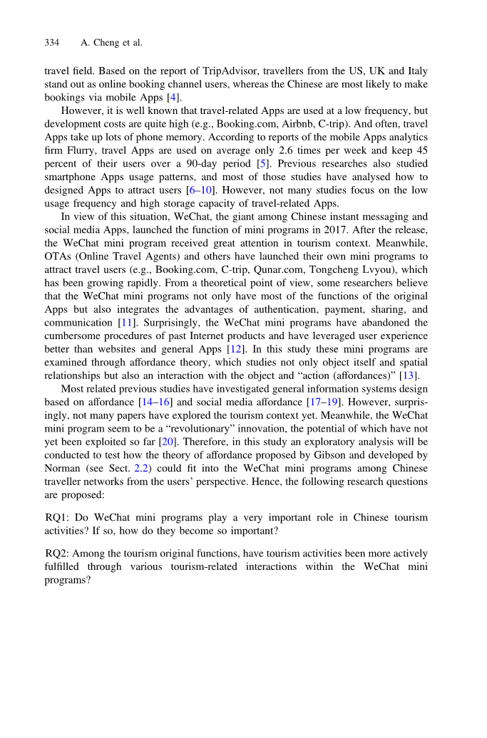 以往的相关研究大多是基于支付能力和社会化媒体支付能力的一般信息系统设计。然而,令人惊讶的是,还没有多少论文探讨过旅游背景。与此同时,微信小程序似乎是一种“革命性”的创新,其潜力迄今尚未得到开发。因此,在本研究中,将进行探索性分析,以检验吉布森提出的、诺曼发展的负担理论(见第四节)2.2)可以从用户的角度进入中国旅游网络中的微信小程序。因此,提出以下研究问题: