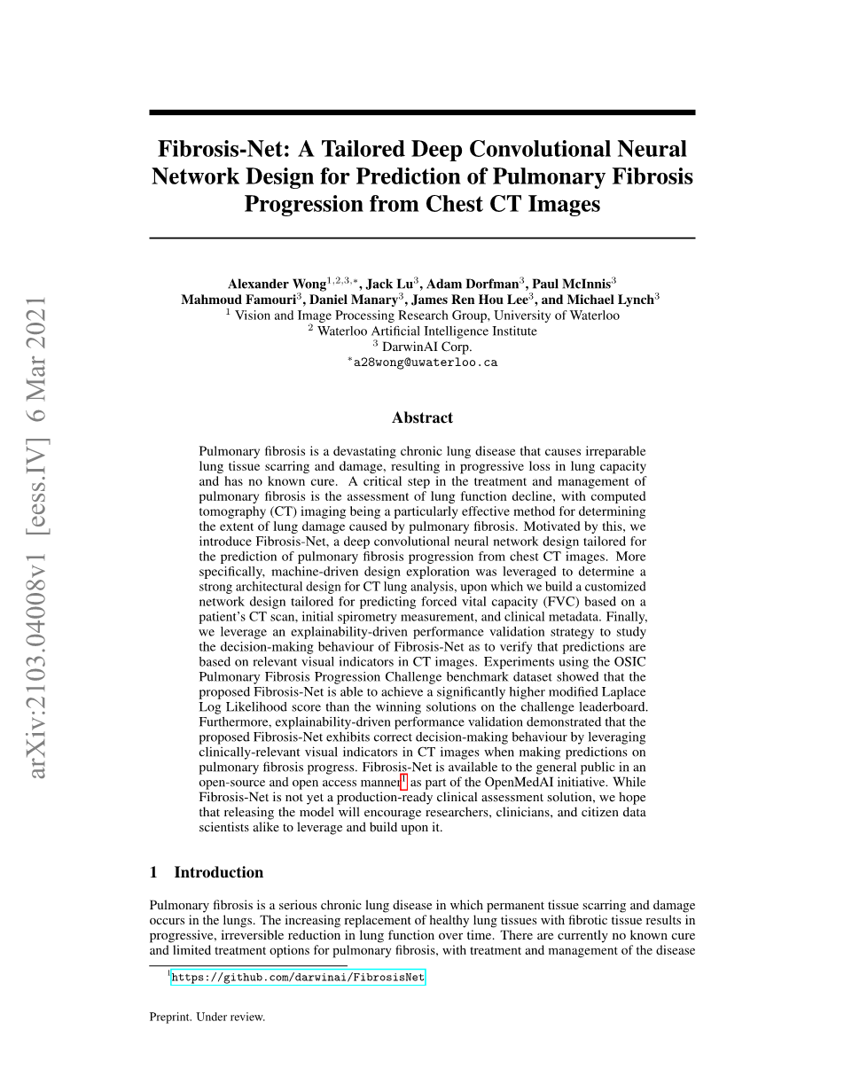 基于机器学习对肺纤维化的计算机辅助临床决策支持的潜力,在本研究中我们介绍了Fibrosis Net,一种专为从胸部CT图像预测肺纤维化进展而设计的深度卷积神经网络。此外,为了探索Fibrosis Net的决策行为,我们利用可解释性驱动的性能验证策略来审核Fibrosis Net,以验证预测是否基于CT图像中的相关视觉指标。作为OpenMedAI倡议的一部分,Fibrosis Net以开源和开放访问的方式向公众开放用于医疗人工智能解决方案,目前包括COVID-Net[23,24,25,26]方案和Cancer-Net[27]方案。虽然Fibrosis Net还不是一个可用于生产的筛查解决方案,但我们希望该模型和数据集的发布将鼓励研究人员、临床医生和公民数据科学家都可以利用和建立它。