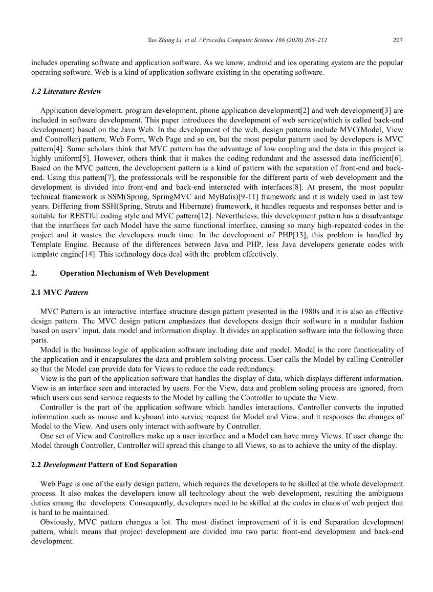 软件开发包括应用程序开发、程序开发、移动应用程序开发和Web开发。本文介绍基于Java Web的Web服务端开发(一般称为后端开发)。在Web开发中的设计模式包括MVC(Model, View and Controller)模式、Web Form、Web Page等,但开发人员使用最多的模式是MVC模式。有学者认为 MVC 模式具有高内聚低耦合的优点,但是,也有人认为它会产生编码冗余并且让数据评估效率低下。基于MVC模式的开发模式是一种前后端分离的开发模式。这种模式让开发人员分别负责 Web 开发的不同部分,由此将开发分为前端开发和与接口交互的后端开发。目前最流行的技术框架是SSM(Spring, SpringMVC 和 MyBatis)框架,近几年得到了广泛的应用。与 SSH(Spring、Struts 和 Hibernate)框架不同,SSM框架能更好地处理请求和响应,能适用于 RESTful 编码风格和 MVC 模式。但是,这种开发模式的缺点是每个Model的接口都具有相同的功能接口,导致项目中有很多高重复性代码,浪费了开发人员很多时间。在 PHP 的开发中,这个问题是由 Template Engine 来处理的。由于 Java 和 PHP 之间的差异,只有少数的Java开发人员使用模板引擎生成代码。而这项技术确实有效地解决了这个问题。
