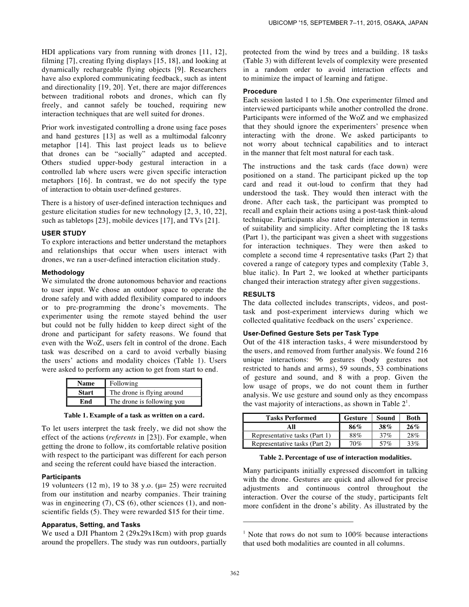 每个实验都持续在1到1.5个小时。一名实验人员拍摄并会见参与者,另一名实验人员则控制着无人机。参与者将被告知WoZ是一种怎样的形式,我们强调他们与无人机互动时忽略实验人员的存在,不要担心飞行技术能力问题,以最自然的交互方式来进行每项任务。