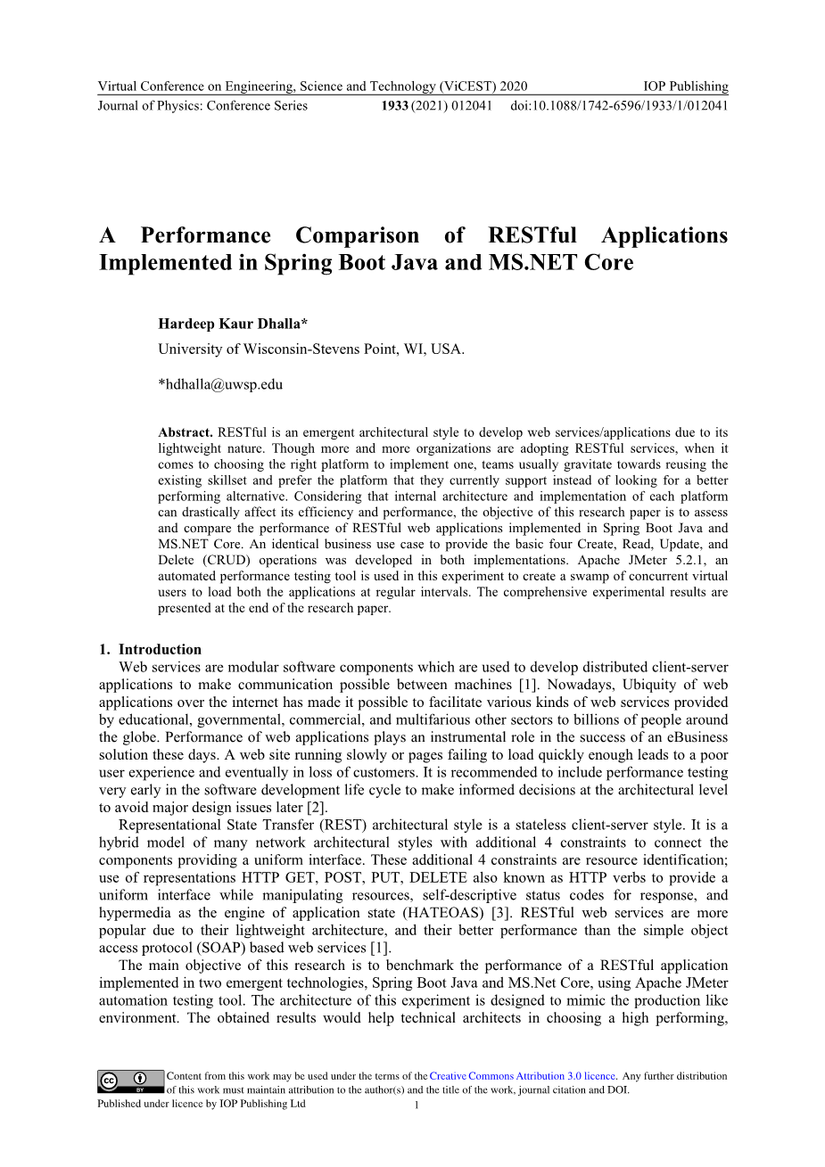 本研究的重点是使用Apache JMeter测试工具,通过负载测试,对MS.NET Core和Spring Boot Java技术实现的RESTful网络应用的性能进行对比。