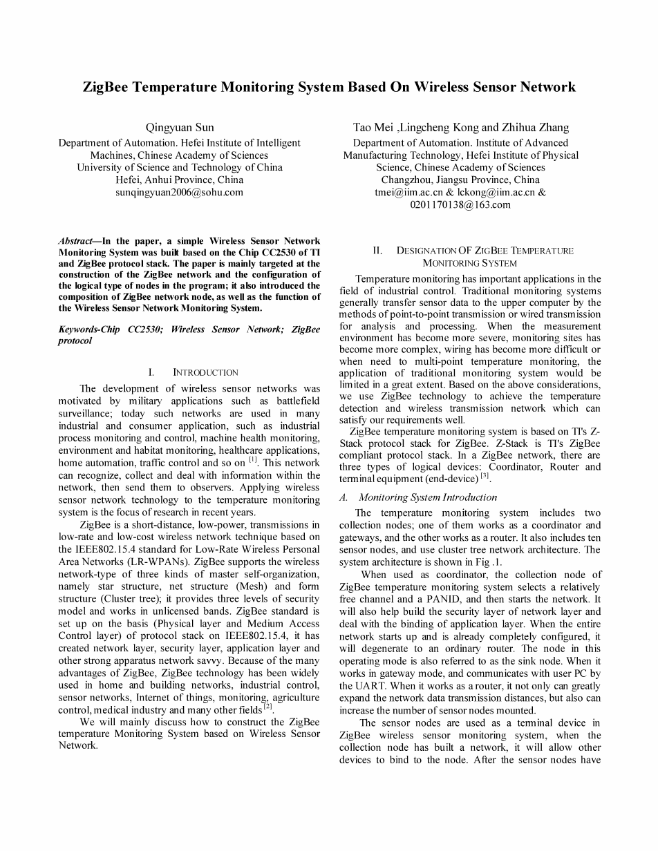 基于ZigBee协议栈的ZigBee温度监测系统。Z-Stack是TI的ZigBee兼容的协议栈。在ZigBee网络中,有三种类型的逻辑设备:协调器,路由器和终端设备(终端设备)。