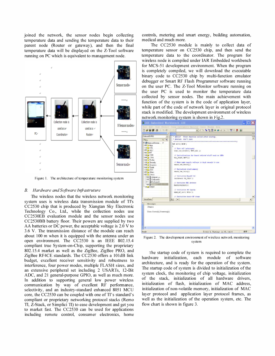 无线网络监控系统采用的是TI的CC2530芯片,是由湘潭天电子科技有限公司生产的无线数据传输模块的无线节点,同时采集节点采用cc2530评价模块和传感器节点使用cc2530电池地板。他们的能源是由两个电池或直流电源供电,可接受的电压为2 V至3.6V。该模块的传输距离可以达到100米的时候,它配备了一个开放的环境下的天线。CC2530是符合IEEE 802.15.4标准的真正的片上系统,支持专有802.15.4市场以及ZigBee,ZigBee Pro和ZigBee RF4CE标准。CC2530提供101db链接预算,良好的接收灵敏度和抗干扰性,四种供电模式,和广泛的外设集,包括2 USARTS、12位ADC,21通用GPIO,以及更多。除此之外,通过RF方式达到一般的低功耗和无线通信,以及业界标准的增强型8051 MCV核心。CC2530可以再加上一个完全的标准的或专有的网络协议栈(REMO Ti,Z-Stack,或Simplici Ti)并让你的市场快速发展。CC2530可以使用的应用程序,包括远程控制、消费电子、家庭控制、计量、智能能源、楼宇自动化、医疗和更多。
