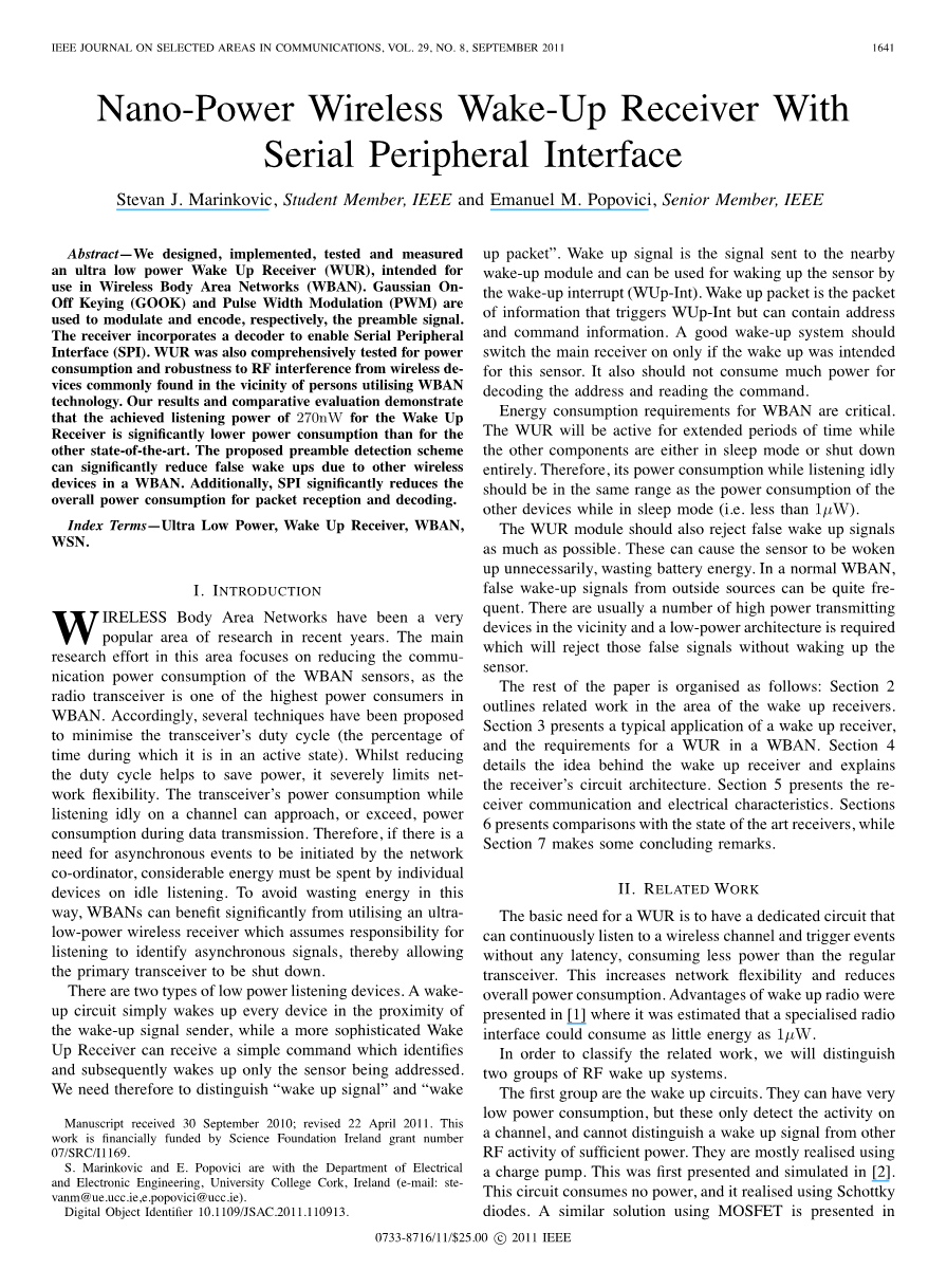 无线身体局域网近年来一直是非常受欢迎的研究领域。该领域的主要研究工作重点是降低WBAN传感器的通信功耗,因为无线电收发器是WBAN中最高功耗的部件之一。因此,已经提出了几种技术来最小化收发机的占空比(其处于活动状态的时间的百分比)。虽然减少占空比有助于节省电力,但却严重限制了网络的灵活性。收发器的功耗在通道上闲置时可以接近或超过数据传输期间的功耗。因此,如果有的异步事件需要由网络协调员发起的话,单个设备必须花费相当多的能量进行空闲聆听。为了避免以这种方式浪费能量,WBAN可以从利用超低功率无线接收器中获益,该接收机承担监听,识别异步信号的责任,从而允许主收发器被关闭。