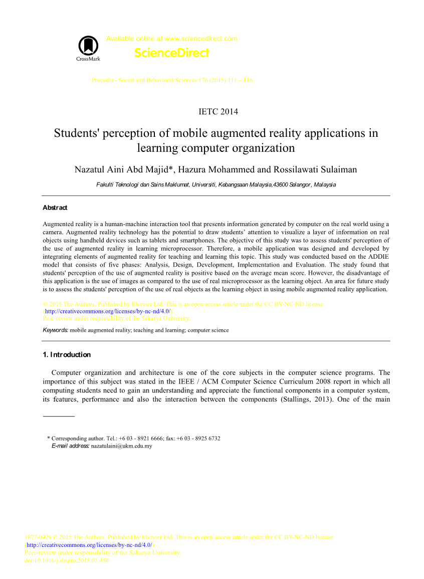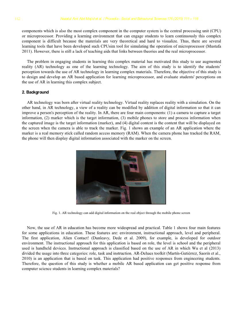 在开发阶段,三个工具被使用:x Eclipse集成开发环境(IDE)为Android平台的开发使用提供了平台,Java Metaio SDK是基于“增大化现实”技术的发展应用程序x GIMP图像编辑的开发阶段的SDK,用户界面上主要有有五个按钮,A,B,C,D和E按钮。当学生点击按钮A并跟踪主板的图像时,屏幕上显示的数字材料就是一个视频。学生需要回答一些基于视频的简单问题。《社会与行为科学》176(2015)111 - 116。当学生点击按钮B时,数字信息会显示在屏幕上,同时音频也会播放,并解释了微处理器的概念和基本功能。为了增加学生在主板上的一些组件的知识,学生可以点击按钮C查看与微处理器相关的主要组件的标签列表。按钮D是为了帮助学生识别微处理器、主存储器和总线在执行命令时是如何协同工作而创建的。按钮E也包含在应用程序中,为学生在实践中放松提供了机会。当学生点击按钮E时,手机屏幕上会显示3D模型。