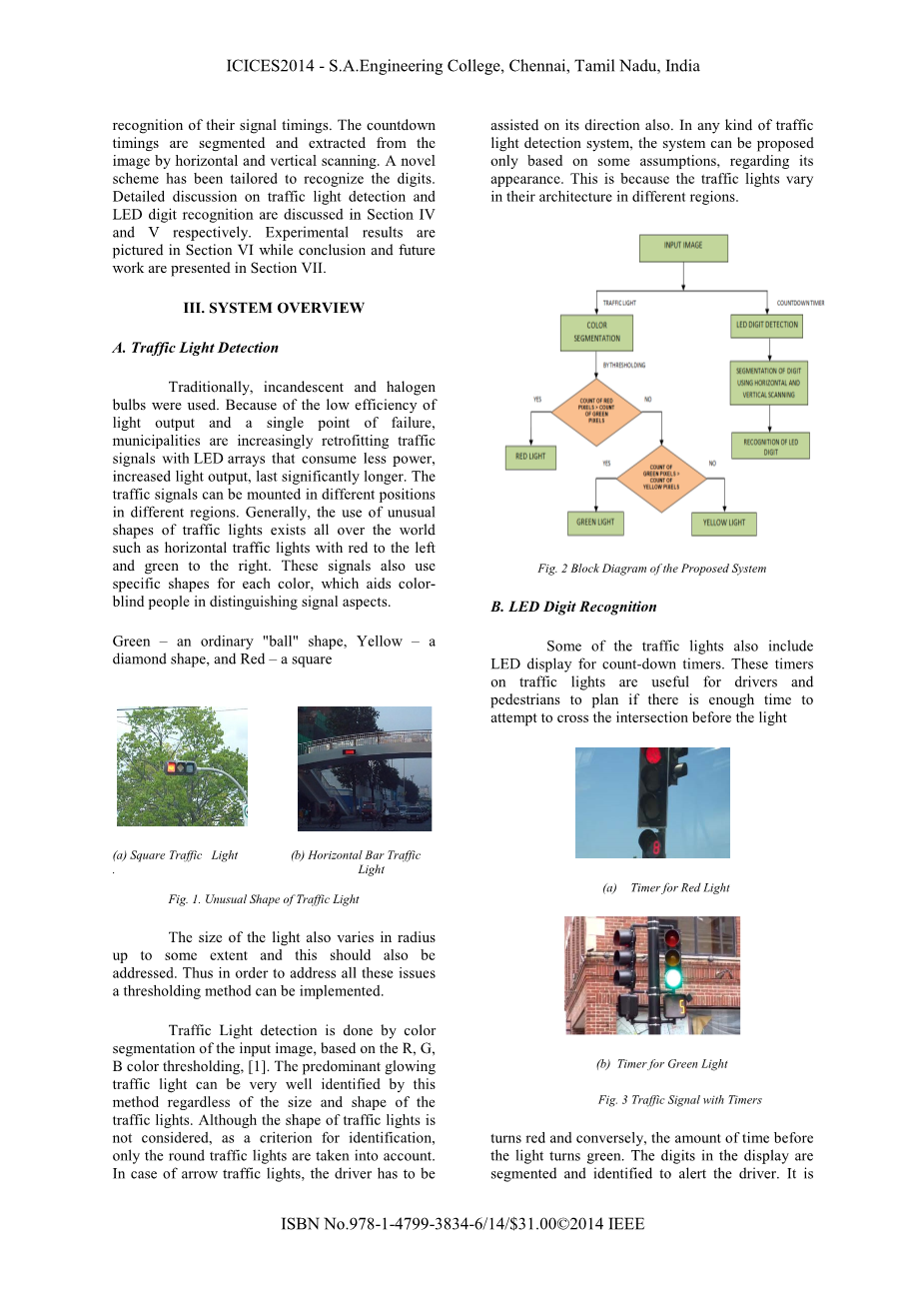 其余部分按如下方式组织。第三节简要概述了我们探测交通灯和识别信号时间的方法。通过水平和垂直扫描从图像中提取出倒数计时。这个新颖的方案是为了识别数字而量身定做的。在第四节和第五节分别讨论了交通灯检测和LED数字识别的详细讨论。实验结果在第六章中得到了描述,而结论和未来的工作是在第七节。