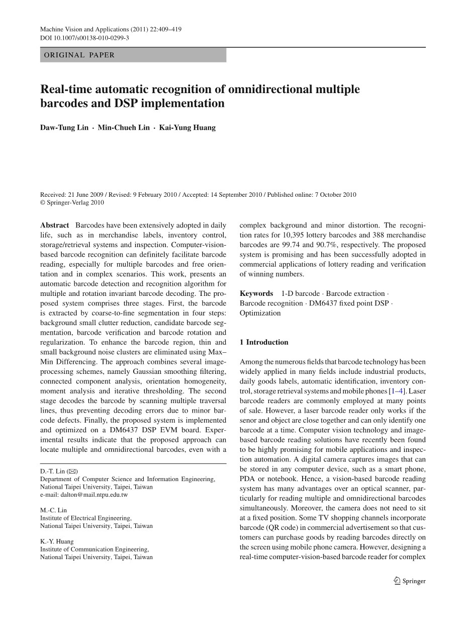 摘要:条形码已广泛应用于日常生活中,例如商品标签,库存控制,存储/回收系统和检查。基于计算机视觉的条形码识别肯定有助于条形码读取,特别是对于多个条形码和自由空间以及复杂场景。 这项工作,提出了自动条形码检测和识别算法,用于多重和旋转不变条形码解码。提出的系统包括三个阶段。首先,通过四个步骤中的粗到细分割来提取条形码:背景小杂波减少,候选条形码分割,条形码验证和条形码旋转和正则化。为了增强条形码区域,薄和小背景噪声集群消除使用最大值减最小值的差分。该方法组合了几种图像处理方案,即高斯平滑滤波,连通分量分析,方向均匀性,矩分析和迭代阈值。第二阶段通过扫描多个遍历行来解码条形码,从而防止由于小的条形码缺陷导致的解码错误。最后,所提出的系统在DM6437 DSP EVM板上实现和优化。经验结果表明,所提出的方法可以定位多个和全向条形码,即使具有复杂的背景和小的失真。10,395个彩票条码和388个商品条码的识别率分别为99.74和90.7%。 提出的系统是有前景的,并已成功地在彩票阅读和获奖数字验证的商业应用中采用。