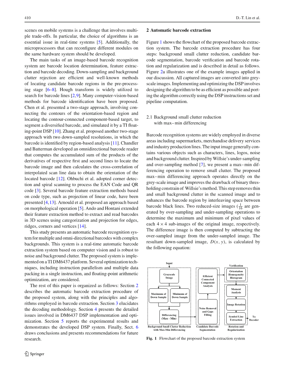 本文的其余部分组织如下:第2节描述了所提出的系统的自动条形码提取过程,以及条形码提取中使用的原理和算法。 第3节阐明了解码方法。 第4节介绍DM6437 DSP实现和优化中涉及的详细问题。 第5节报告实验结果并演示了开发的DSP系统。 最后, 6得出结论并提出未来研究的建议。