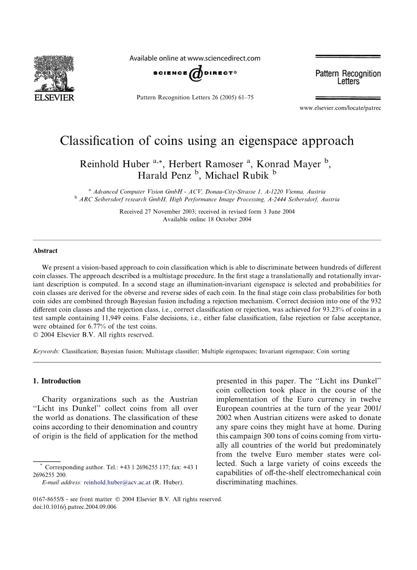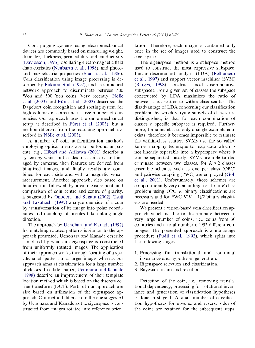 在本文中,我们将描述图像处理和硬币分类。第2节总结了本征空间方法的数学符号,并回顾了应用于硬币分类问题的多个特征空间的概念,在第3节中,关于翻译的不变性,讨论了硬币图案处理的旋转和照明,第4节介绍我们的分类,融合和拒绝方法。第5节介绍结果,结论在第6节中找到。