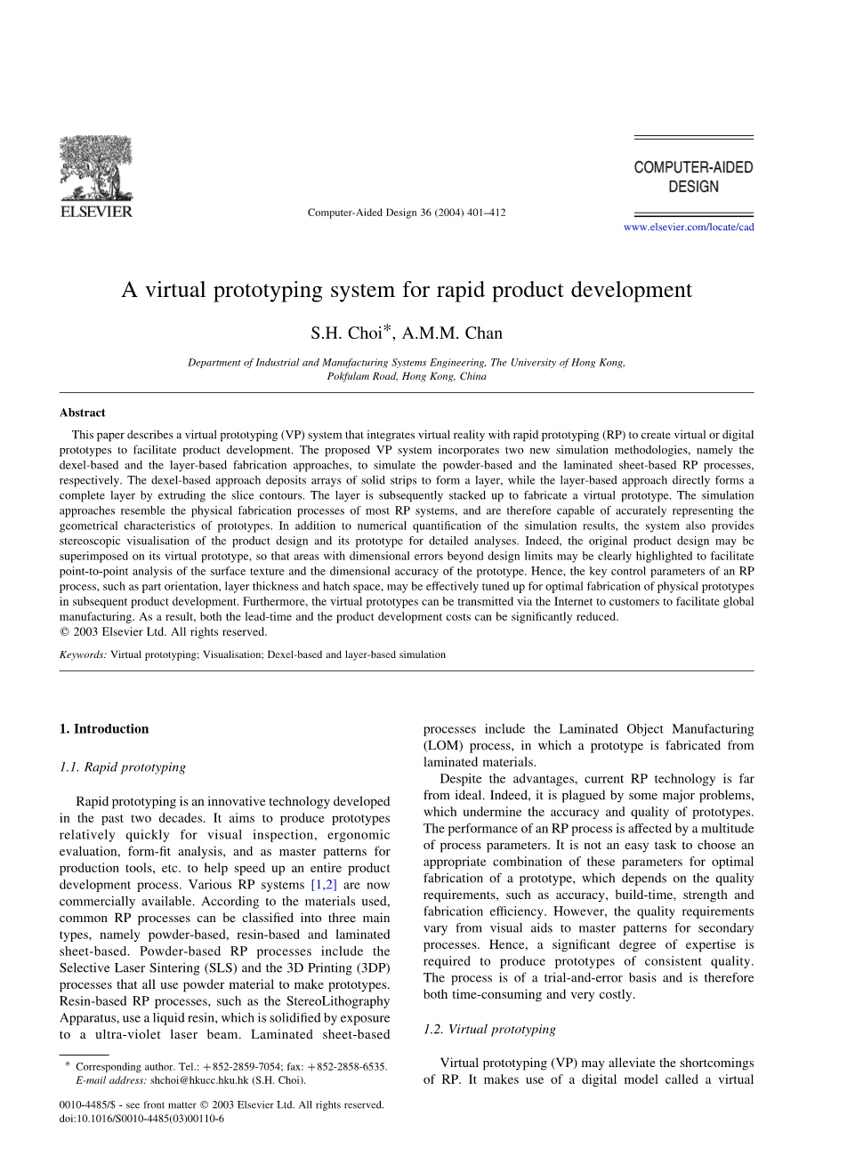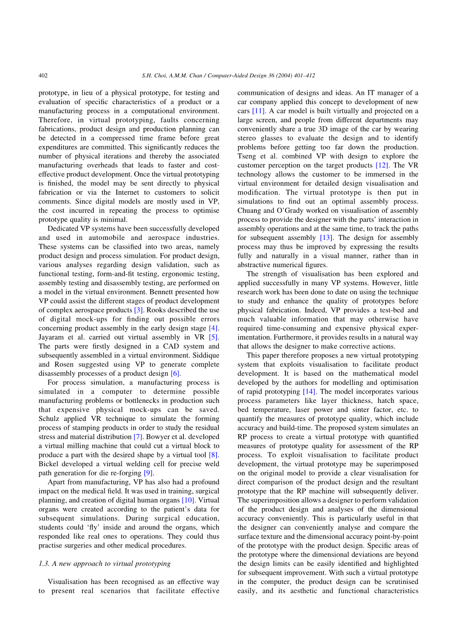 虚拟原型(VP)可以缓解RP的这些缺点。它使用称为虚拟原型的数字模型来代替物理原型,用于测试和产品的具体特性的评价或制造过程在计算环境中。因此,在虚拟原型中,有关的故障制造,产品设计和生产计划在压缩时间帧内检测大支出。这显着减少了物理迭代的数量,从而相关联制造开销,导致更快,有效的产品开发。一旦虚拟原型完成后,模型可以直接发送到物理制造或通过互联网向客户索取注释。由于数字模型大多用于VP,重复该过程进行优化所产生的成本原型质量极低。专用VP系统已成功开发并用于汽车和航空航天工业。这些系统可以分为两个领域,即产品设计和过程模拟。对于产品设计,关于设计验证的各种分析,例如功能测试,形状和拟合测试,人体工程学测试,装配测试和拆卸测试,都要进行在虚拟环境中的模型。 Bennett介绍了VP如何可以协助产品开发的不同阶段的复杂航空航天产品。Rooks描述了使用的数字模型找出可能的错误关于产品装配在早期设计阶段。Jayaram等人在VR中进行虚拟装配。这些部件首先在CAD系统中设计随后在虚拟环境中组装。Siddique和Rosen建议使用VP生成完整产品设计的拆卸过程。对于过程仿真,制造过程是在计算机中模拟以确定可能制造问题或生产中的瓶颈可以节省昂贵的物理模型。Schulz应用VR技术来模拟形成冲压产品的过程,以研究残余物应力和材料分布。Bowyeretal发明可以切割虚拟块的虚拟铣床通过虚拟工具产生具有期望形状的部件。Bickel发明了一种用于精确焊接的虚拟焊接电池用于模具再造的路径生成。除了制造业,VP也有了深刻的对医疗领域的影响。它用于训练,外科规划和创建数字人体器官。虚拟根据患者的数据创建器官随后的模拟。在外科教育期间,学生可以在器官内部和周围“飞行”像真正的操作一样。他们可以这样实践手术和其他医疗程序。