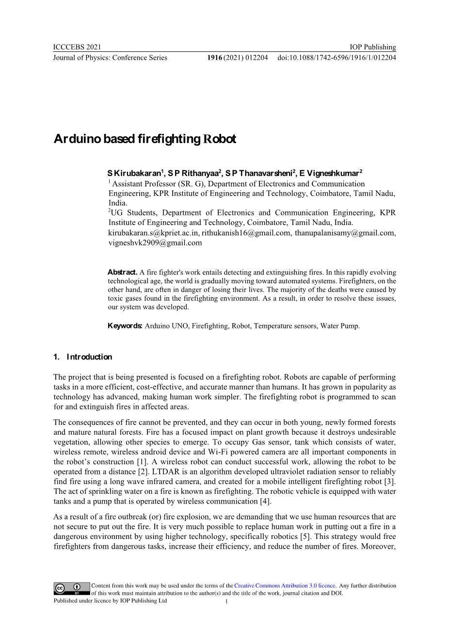 关键词:Arduino UNO 消防 机器人 温度传感器 水泵