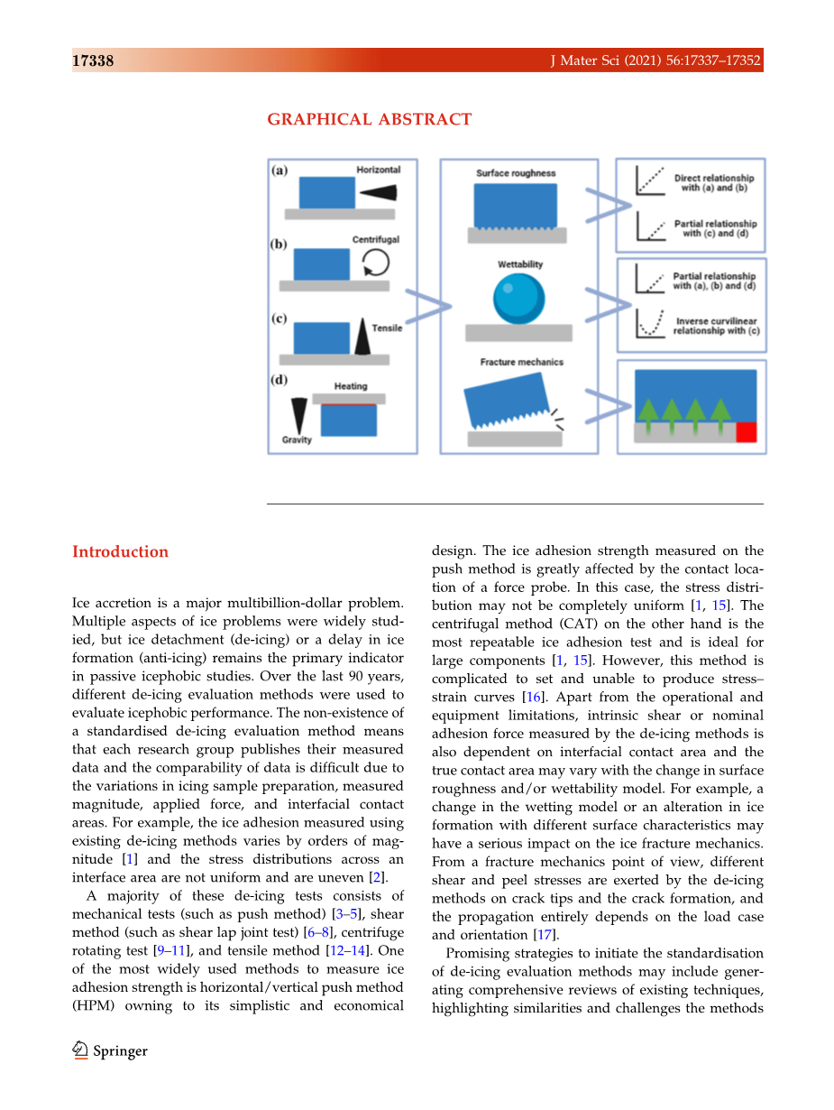 这些除冰测试中的大多数包括机械测试(例如推力法)[3-5] 、剪切法(例如剪力搭接接头 测试)[6-8] 、离心机旋转测试[9-11] ,以及拉伸法 [ 12 – 14 ]。其中,因为其设计简单且经济,测量冰附着强度的最广泛使用的方法之一是水平/垂直推动法(HPM)。推压法测得的冰附着强度受测力探头接触位置的影响很大。在这种情况下,应力分布很可能不是完全均匀的 [1,15]。另一方面,离心法 (CAT) 是可重复性最高的冰附着力测试,是测量大型部件的理想选择 [1,15]。然而,这种方法设置复杂,无法生成应力-应变曲线[ 16]。除操作和设备限制外,通过除冰方法测量的固有剪切力或标称粘附力还取决于界面接触面积,其真实接触面积可能随表面粗糙度和/或润湿性模型的变化而变化。例如,润湿模型的变化或具有不同表面特征的冰状形成的变化可能对冰断裂力学产生严重影响。从断裂力学的角度来看,除冰方法对裂纹尖端和裂纹形成施加不同的剪切应力和剥离应力,其传播完全取决于载荷情况和方向[ 17 ]。