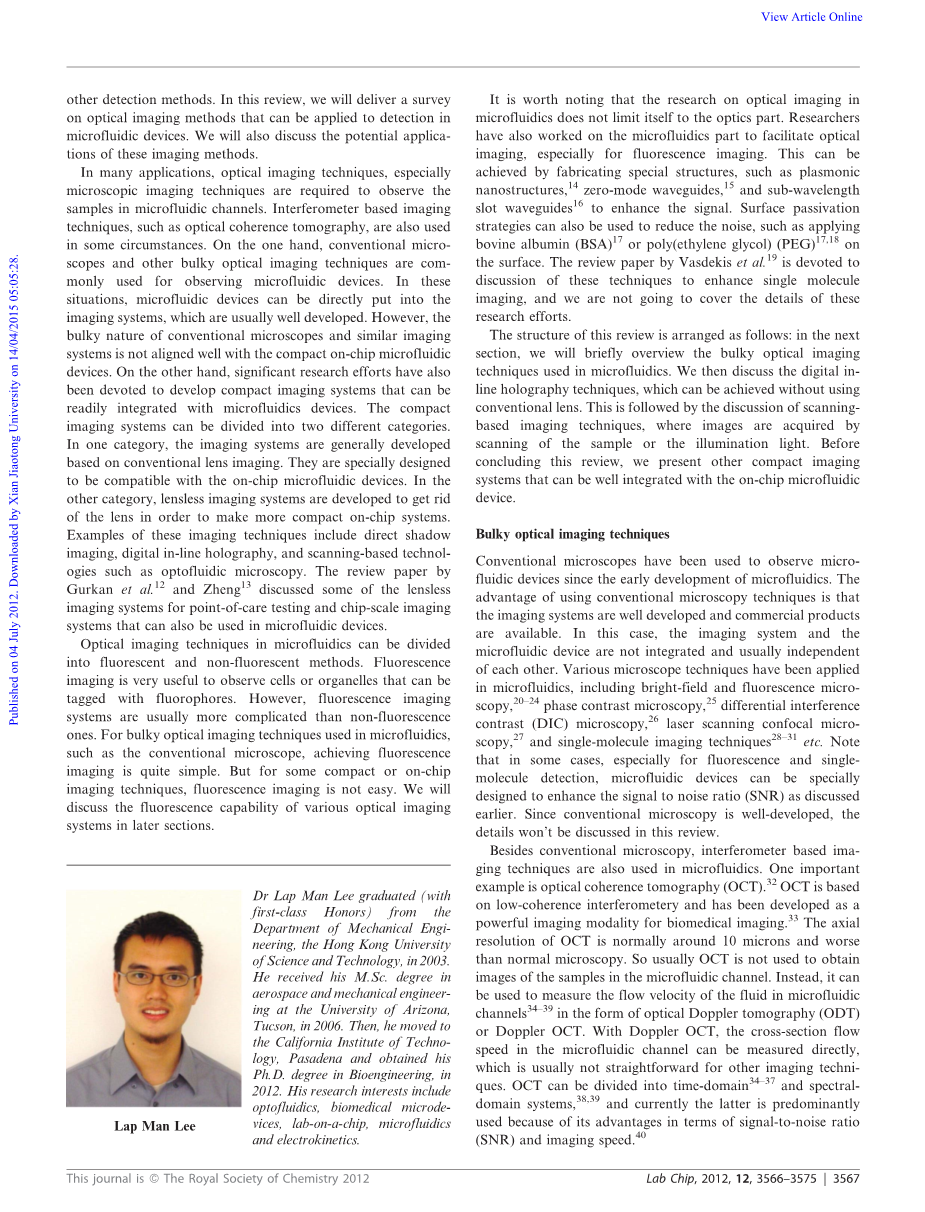 这一审查的结构安排如下:在下一节,我们将简要概述在微流体中使用的庞大的光学成像技术。 然后我们讨论数字式在线全息技术,这可以实现不使用传统的透镜。 这之后是对基于扫描的成像技术的讨论,其中通过扫描样品或照明光来获取图像。 在结束这次审查之前,我们提出其他紧凑型成像系统,可以很好地与片上微流控设备集成。